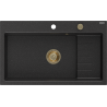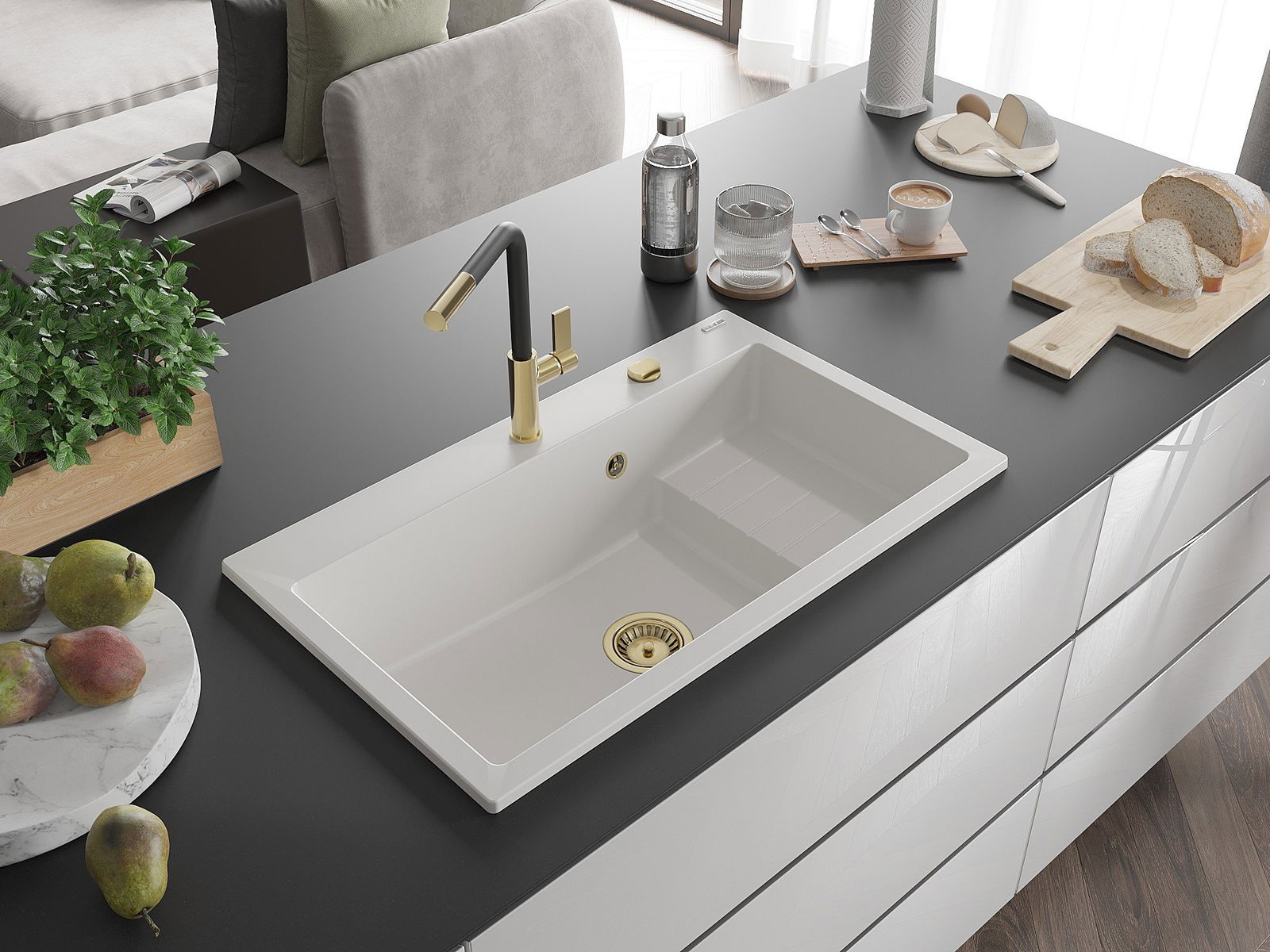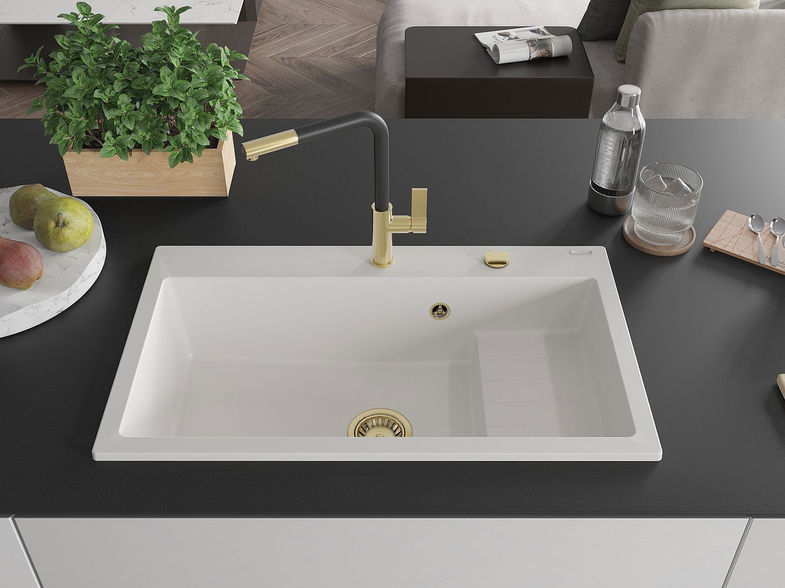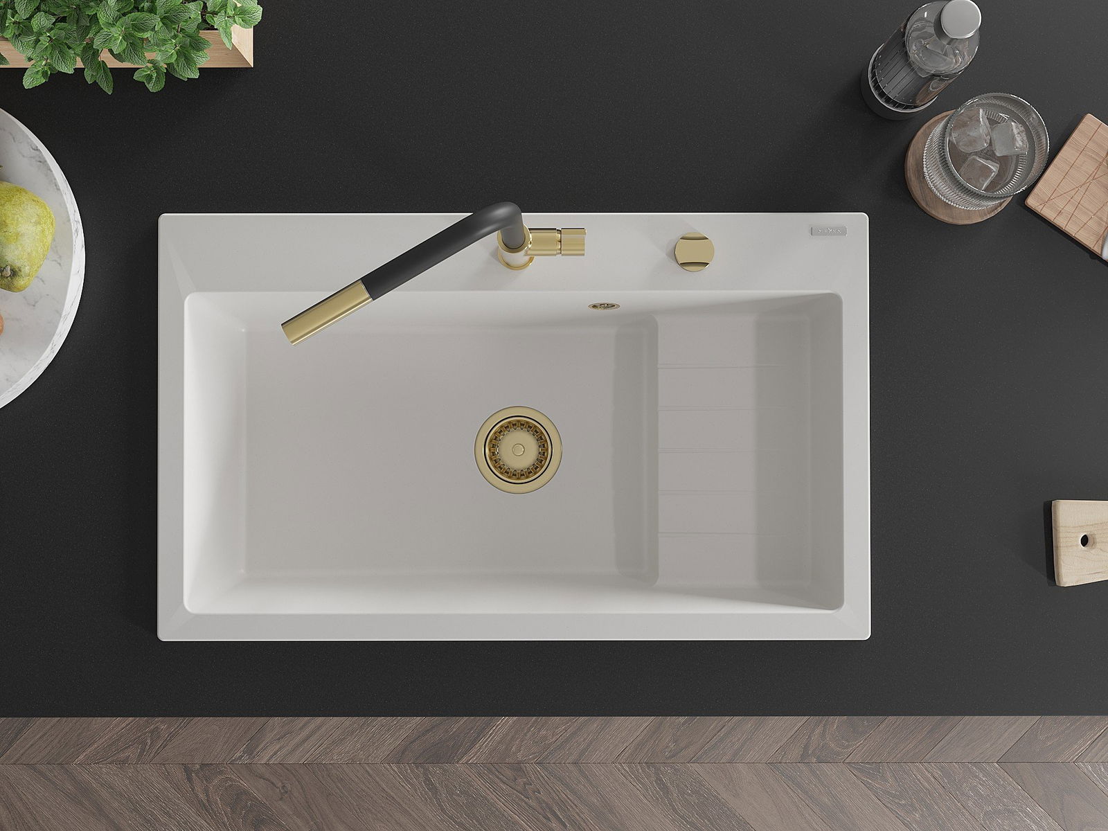 Mexen Omar zlewozmywak granitowy 1-komorowy 800 x 480 mm, biały, syfon złoty - 6520801005-20-G