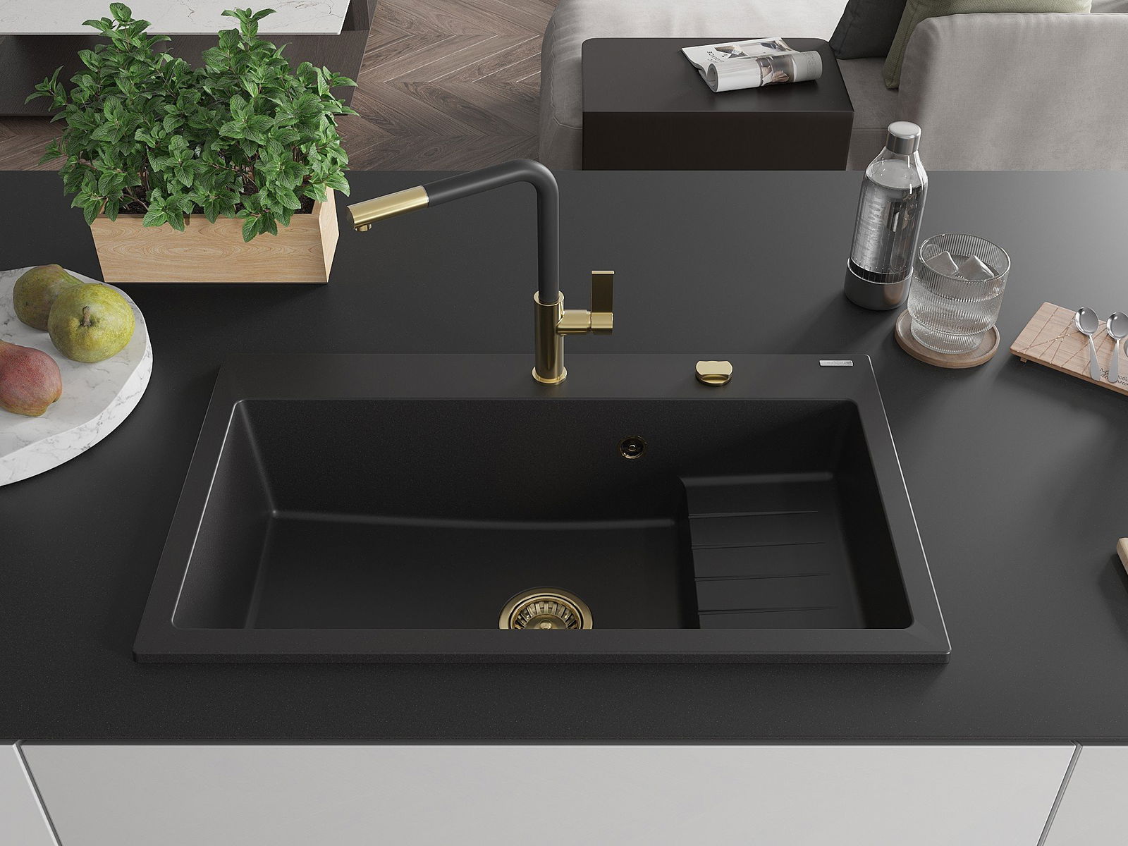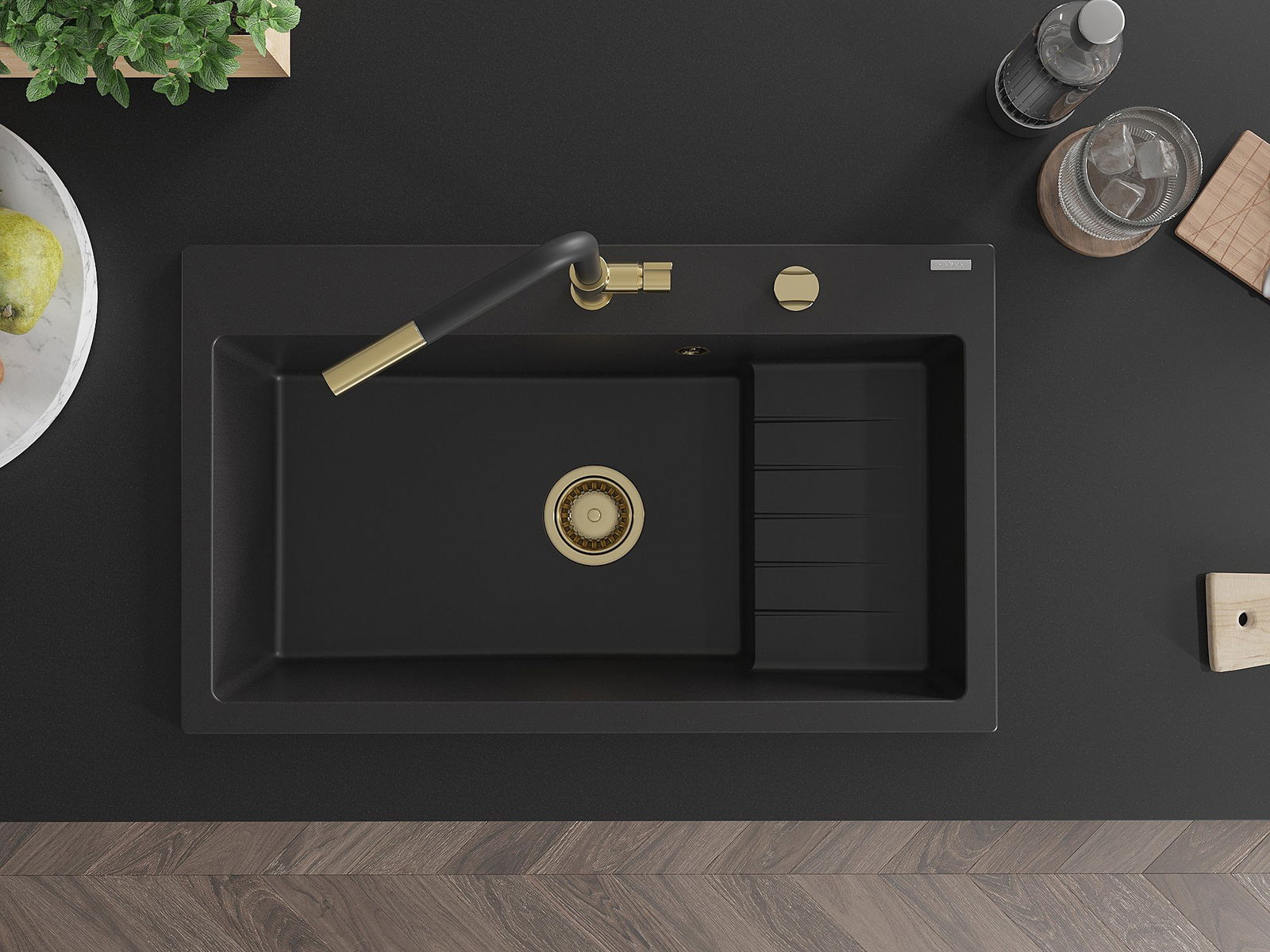 Mexen Omar zlewozmywak granitowy 1-komorowy 800 x 480 mm, czarny, syfon złoty - 6520801005-77-G