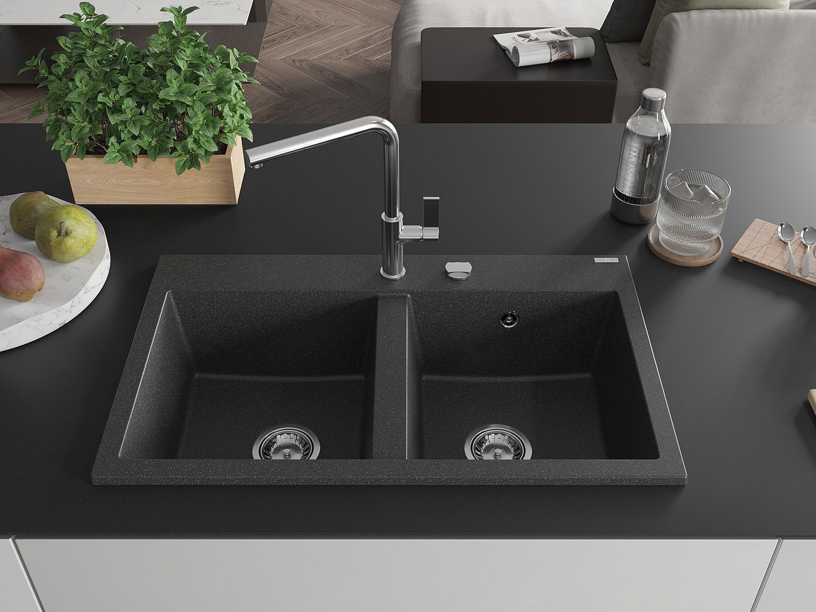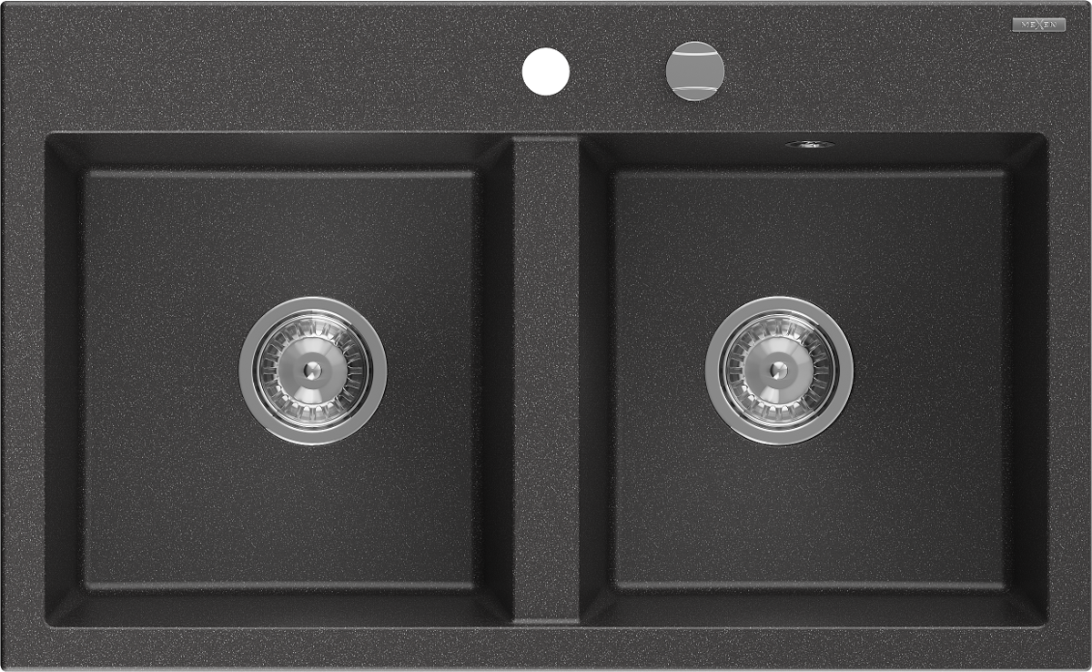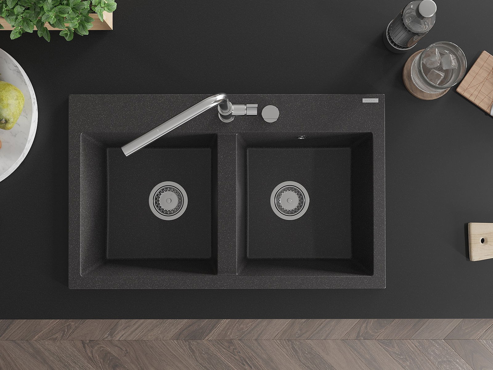 Mexen Hektor zlewozmywak granitowy 2-komorowy 800 x 480 mm, czarny nakrapiany, syfon chrom - 6521802000-76