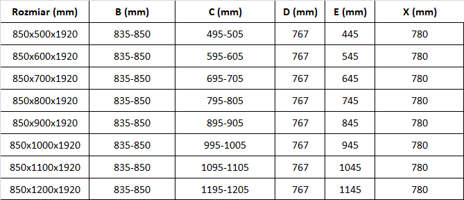 Rozmiar: 85x70 cm (drzwi 85 cm, ścianka 70 cm)