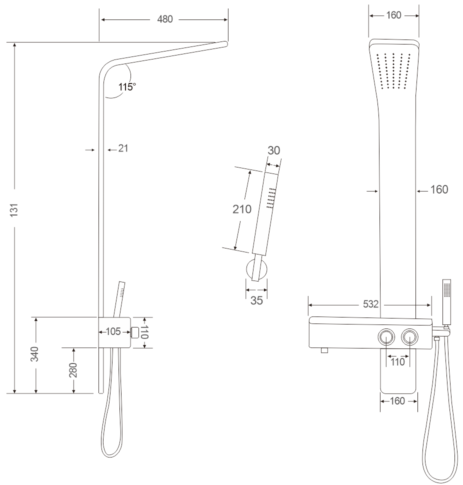 Specyfikacja produktu: Materiał: Stal nierdzewna Kolor: Czarny Wysokość:  131 cm Głębokość: 48 cm Ilość funkcji: 3 Wylewka znajdująca się u dołu półki Praktyczna półka na kosmetyki Zintegrowana deszczownica Słuchawka prysznicowa Wąż z osłoną ze stali nierdzewnej 150 cm Dysze silikonowe Anti-Calc ułatwiają usuwanie kamienia Brak możliwości regulacji ciśnienia wody, włączenie i wyłączenie strumienia z funkcją ON-OFF