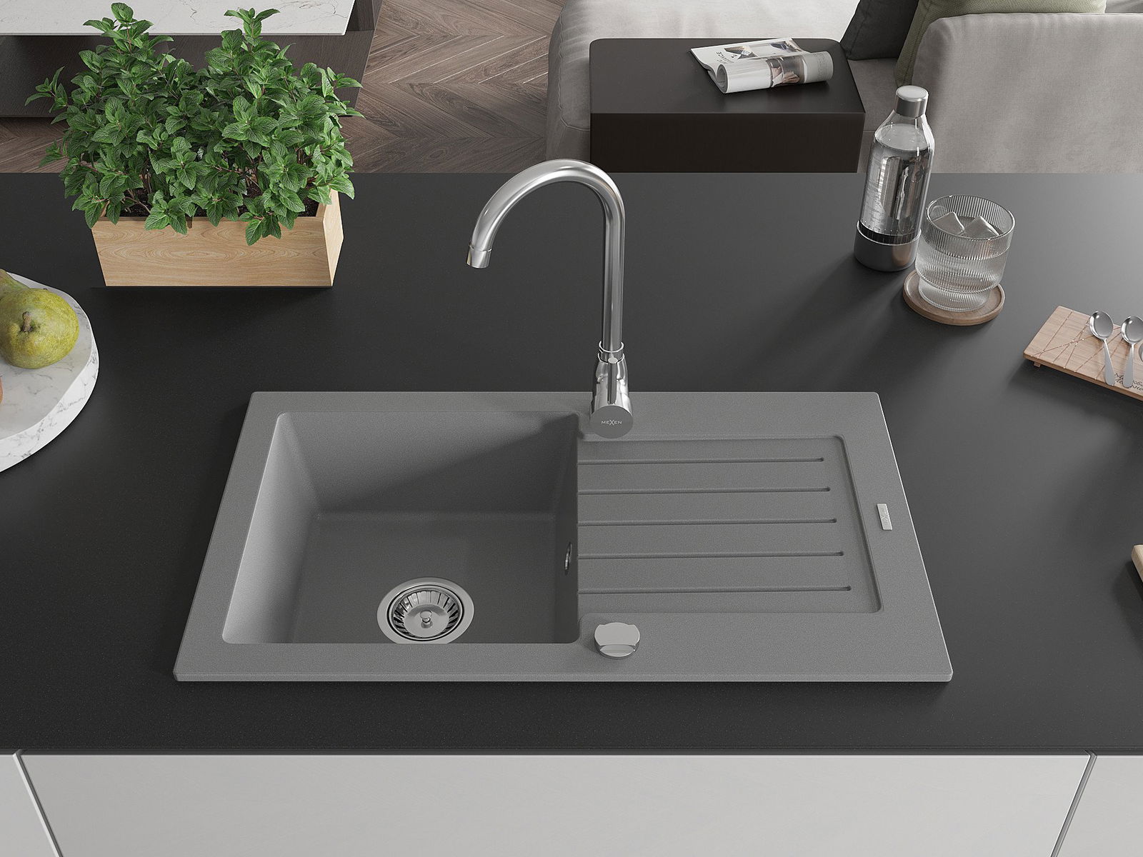 Mexen Pablo zlewozmywak granitowy 1-komorowy z ociekaczem 752 x 436 mm, szary, syfon chrom - 6510751010-71