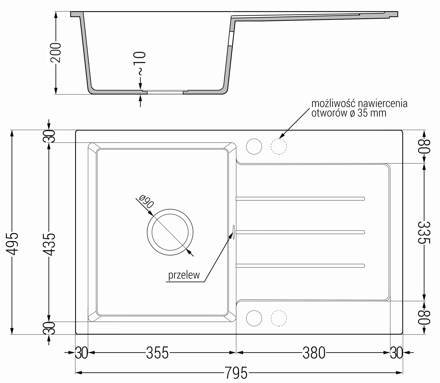 Zlew posiada 2 podfrezowane otwory o średnicy 35 mm, do samodzielnego wybicia. Można je wykorzystać m.in. do montażu dozownika na płyn, który wyeliminuje obecność plastikowych butelek w kuchni i nada jej eleganckiego wykończenia.