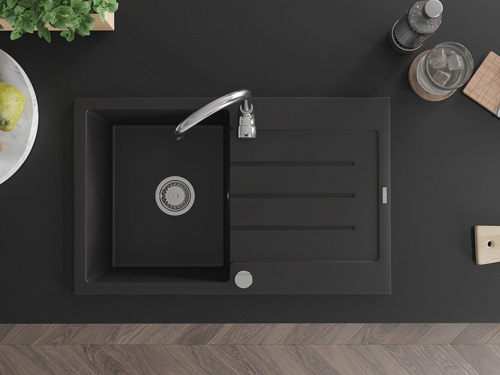 Mexen Bruno zlewozmywak granitowy 1-komorowy z ociekaczem 795 x 495 mm, czarny, syfon chrom - 6513791010-77