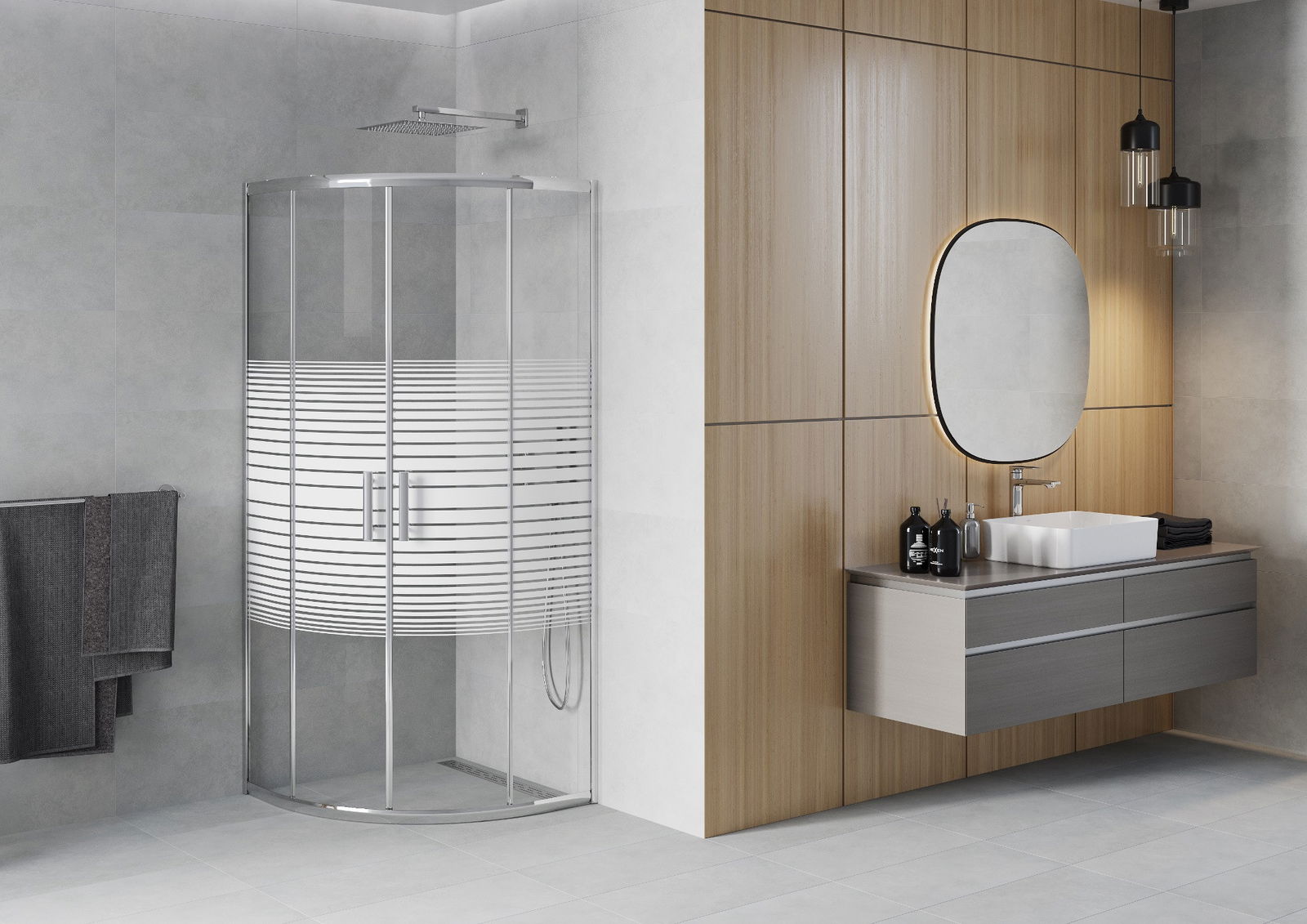 Poręczny i wygodny uchwyt został wykonany z trwałego i odpornego metalu. Modny kształt w połączeniu z wykończeniem dopasowanym do koloru profili nadaje całości nowoczesnego i stylowego wyglądu, podkreślając estetykę każdej łazienki.