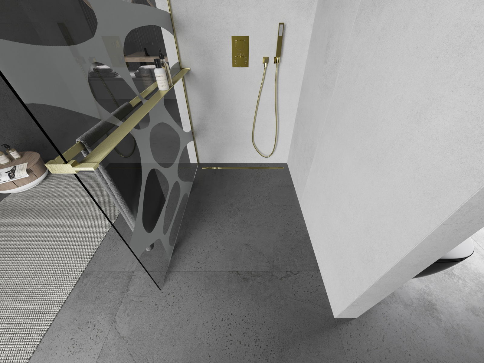 Mexen Kioto+ ścianka prysznicowa z półką Walk-in 90 x 200 cm, biała fala, złota szczotkowana - 800-090-121-55-97