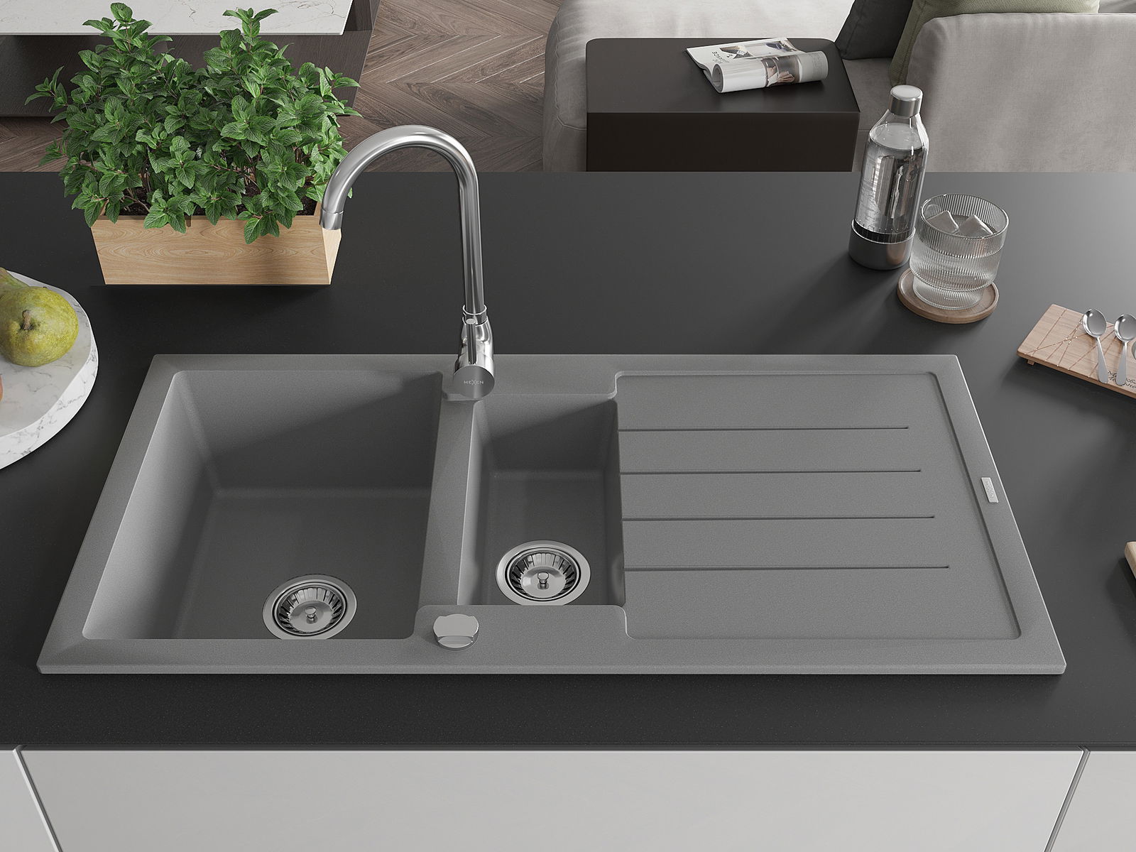 Mexen Andres zlewozmywak granitowy 1,5-komorowy z ociekaczem 1000 x 500 mm, szary, syfon chrom - 6515101510-71