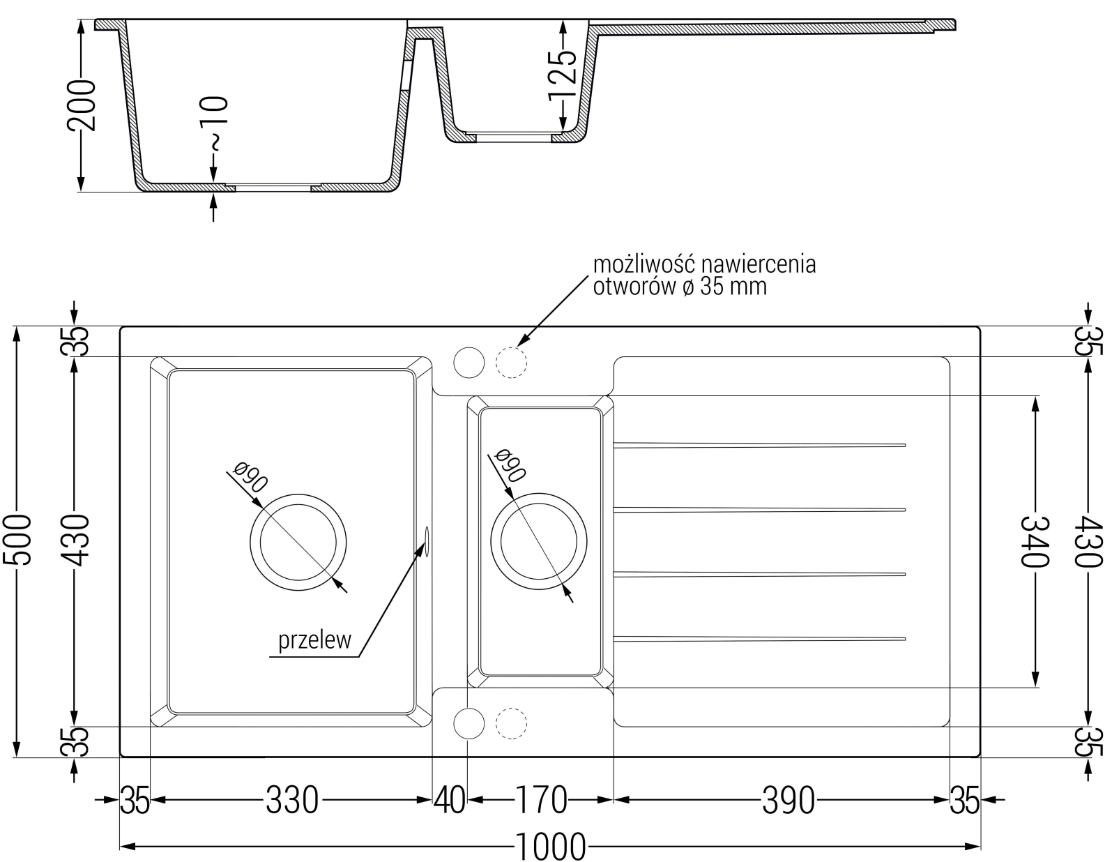 Zlew posiada 2 podfrezowane otwory o średnicy 35 mm, do samodzielnego wybicia. Można je wykorzystać m.in. do montażu dozownika na płyn, który wyeliminuje obecność plastikowych butelek w kuchni i nada jej eleganckiego wykończenia.