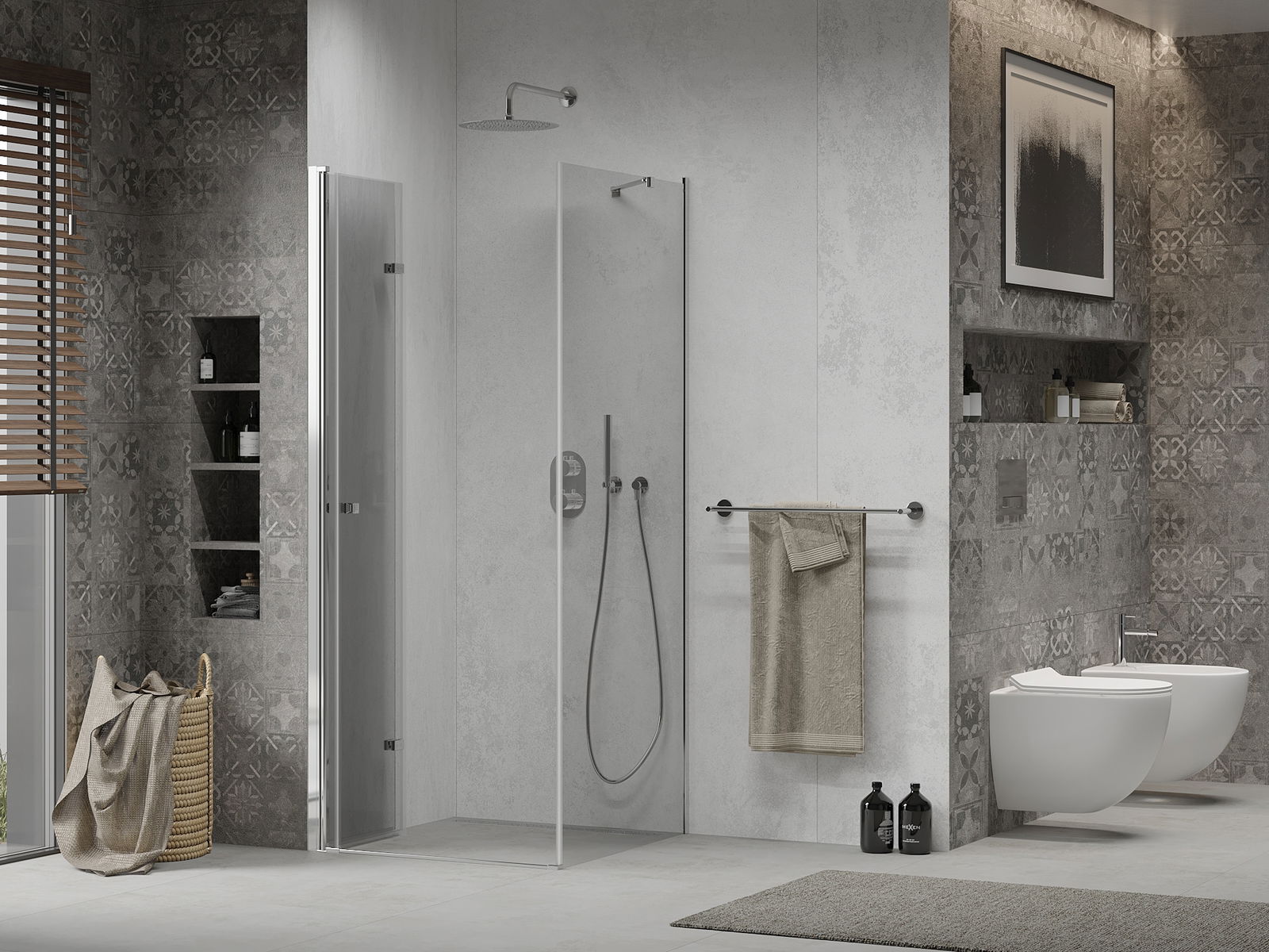 Możliwość składania drzwi, zarówno do zewnątrz, jak i do wewnątrz, pozwala uzyskać więcej przestrzeni podczas niekorzystania z prysznica. Jest to idealne rozwiązanie do mniejszych łazienek, maksymalnie wykorzystujące dostępną powierzchnię.