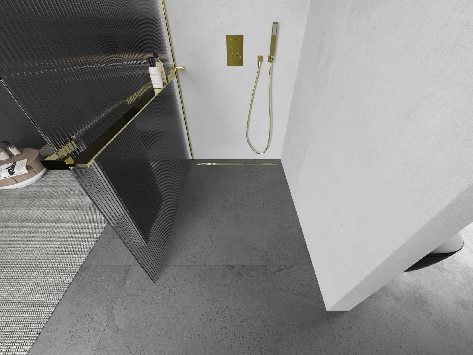Mexen Kioto+ L ścianka prysznicowa z półką Walk-in 110 x 200 cm, prążki, złota - 800-110-123-50-09