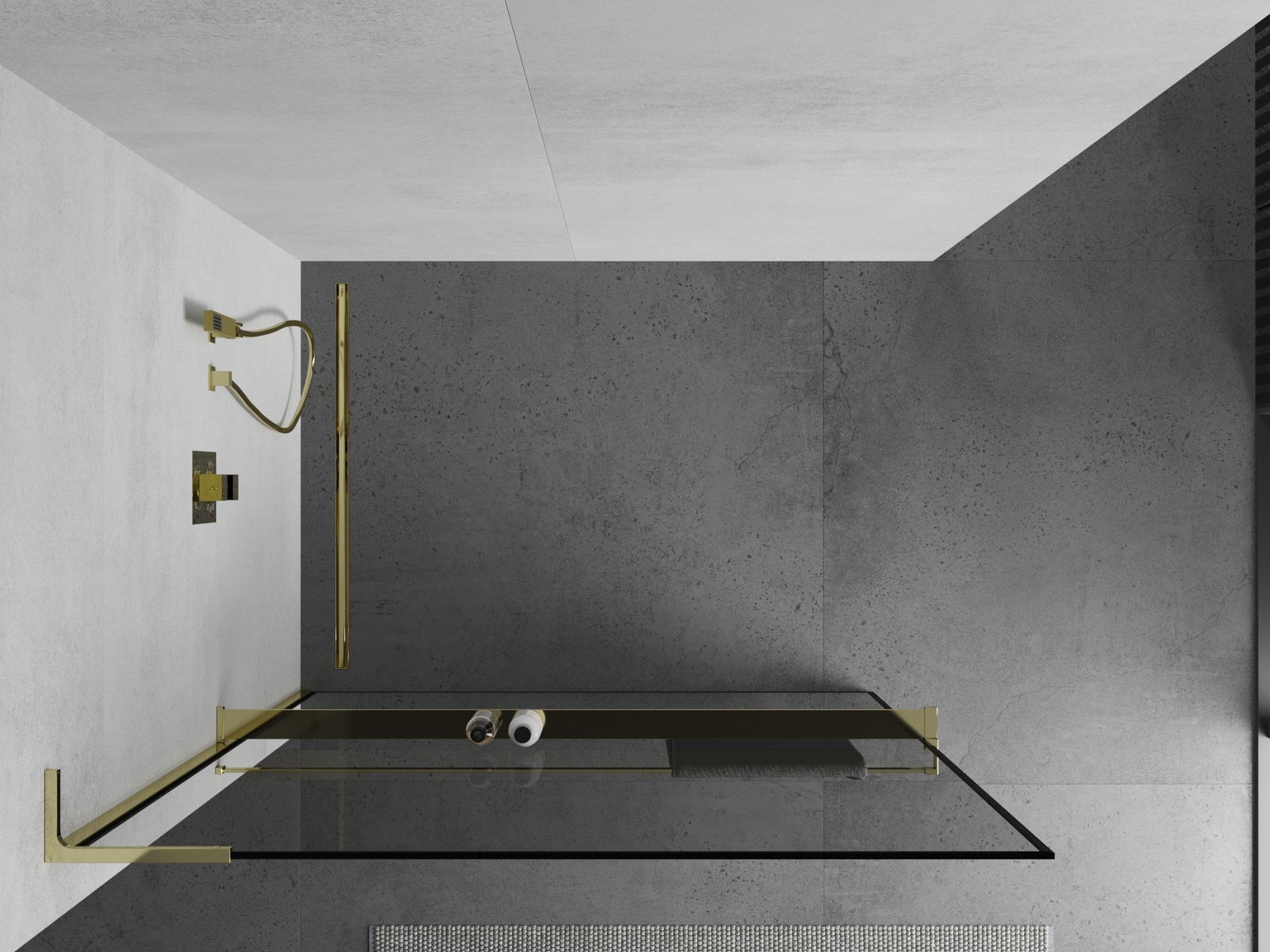 Mexen Kioto+ L ścianka prysznicowa z półką Walk-in 110 x 200 cm, czarna ramka, złota - 800-110-123-50-70