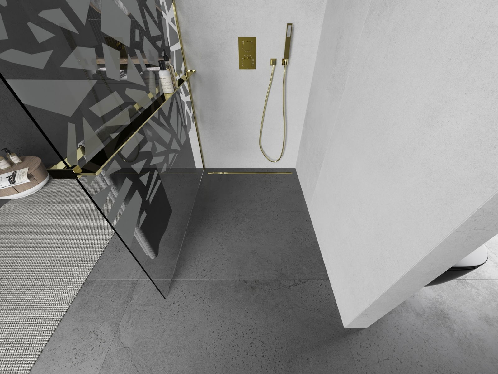 Mexen Kioto+ L ścianka prysznicowa z półką Walk-in 90 x 200 cm, biały wzór, złota - 800-090-123-50-85