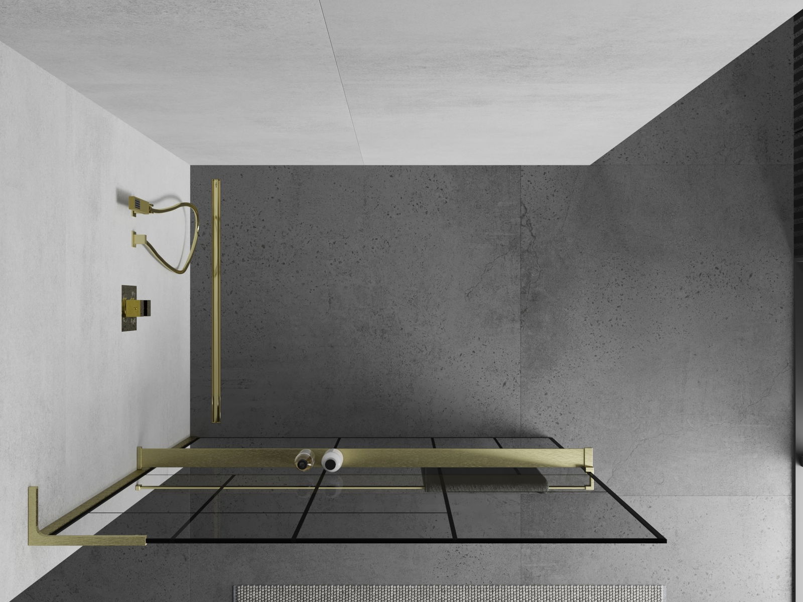 Mexen Kioto+ L ścianka prysznicowa z półką Walk-in 70 x 200 cm, czarny wzór, złota szczotkowana - 800-070-123-55-78