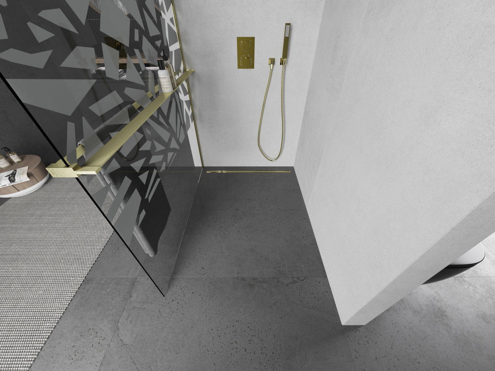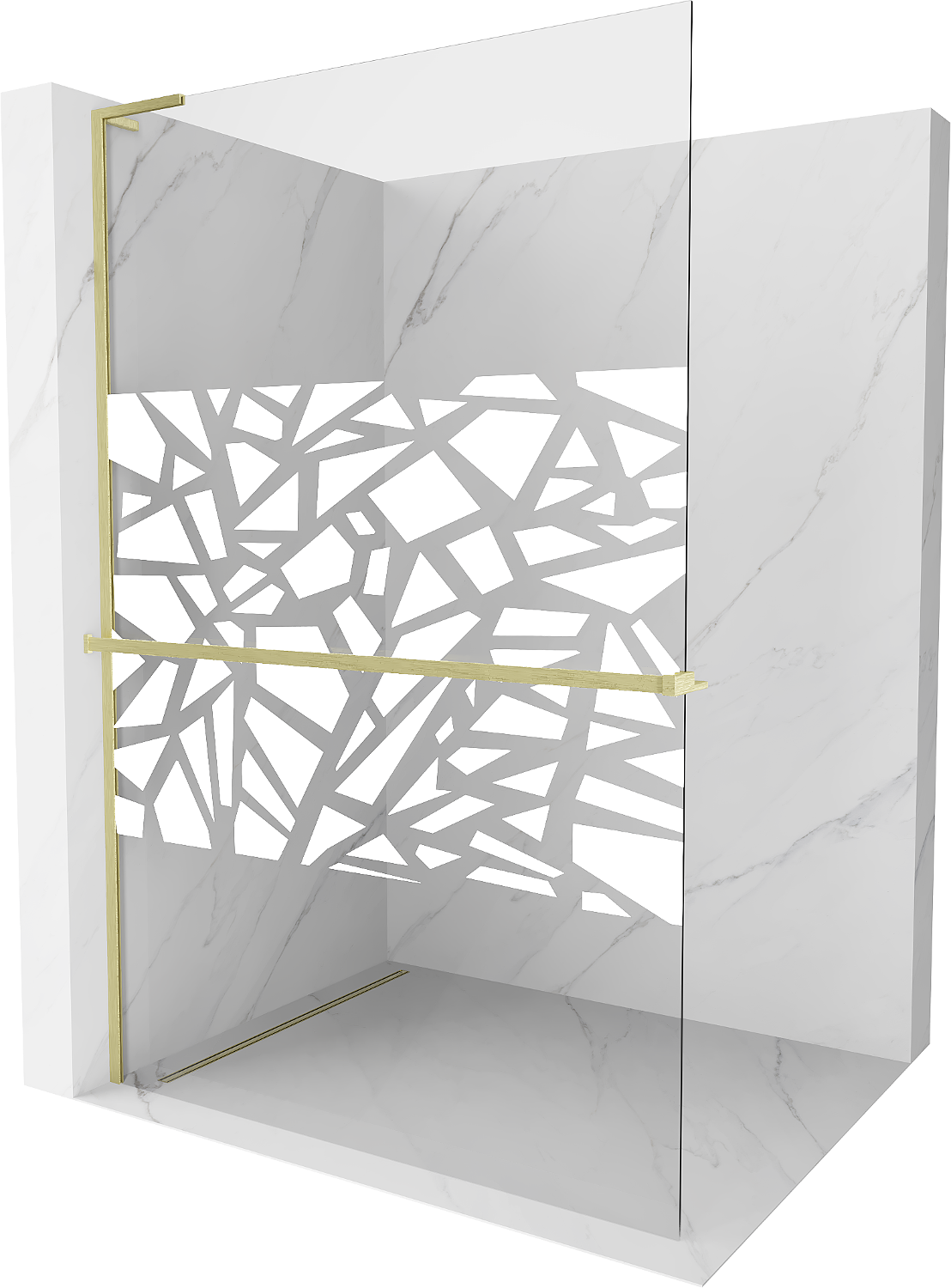 Mexen Kioto+ L ścianka prysznicowa z półką Walk-in 110 x 200 cm, biały wzór, złota szczotkowana - 800-110-123-55-85