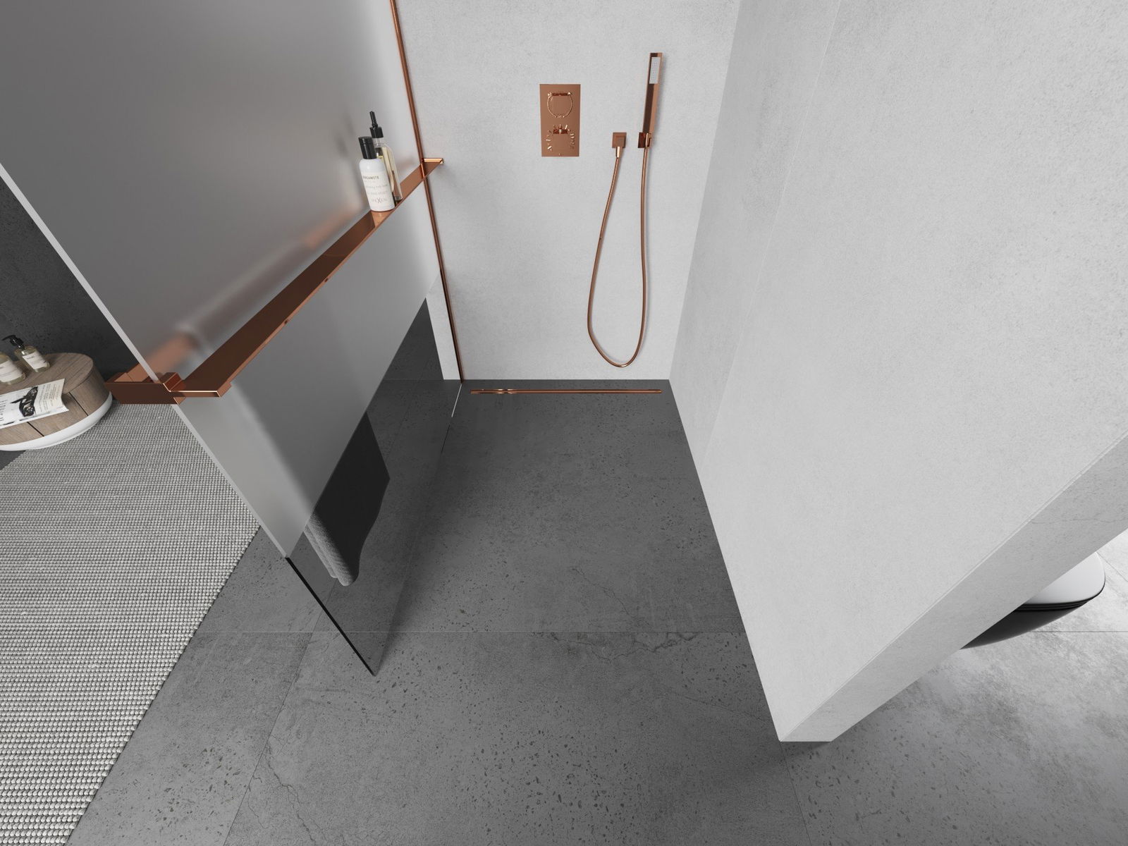 Mexen Kioto+ L ścianka prysznicowa z półką Walk-in 100 x 200 cm, transparent/szron, różowe złoto - 800-100-123-60-35