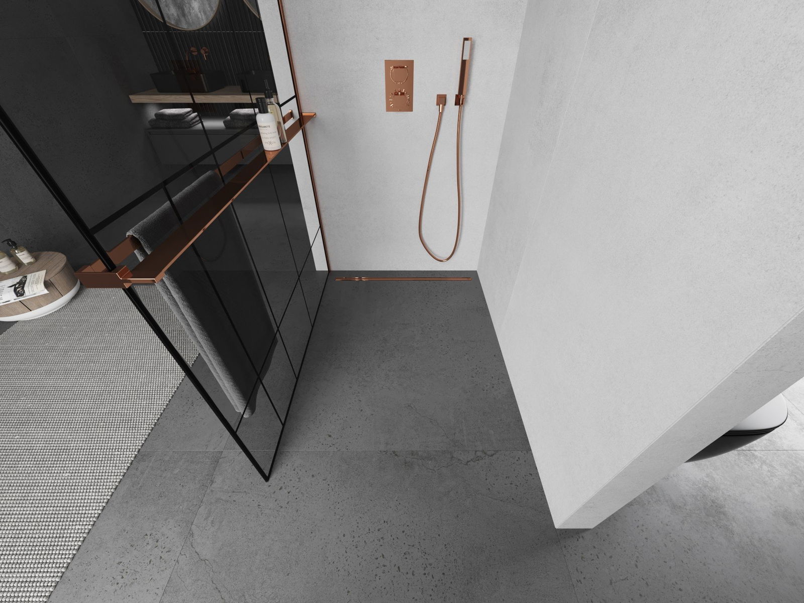 Mexen Kioto+ L ścianka prysznicowa z półką Walk-in 80 x 200 cm, czarny wzór, różowe złoto - 800-080-123-60-78