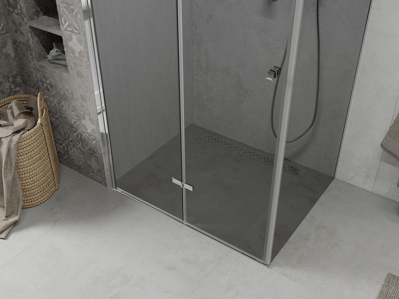 Możliwość składania drzwi, zarówno do zewnątrz, jak i do wewnątrz, pozwala uzyskać więcej przestrzeni podczas niekorzystania z prysznica. Jest to idealne rozwiązanie do mniejszych łazienek, maksymalnie wykorzystujące dostępną powierzchnię.