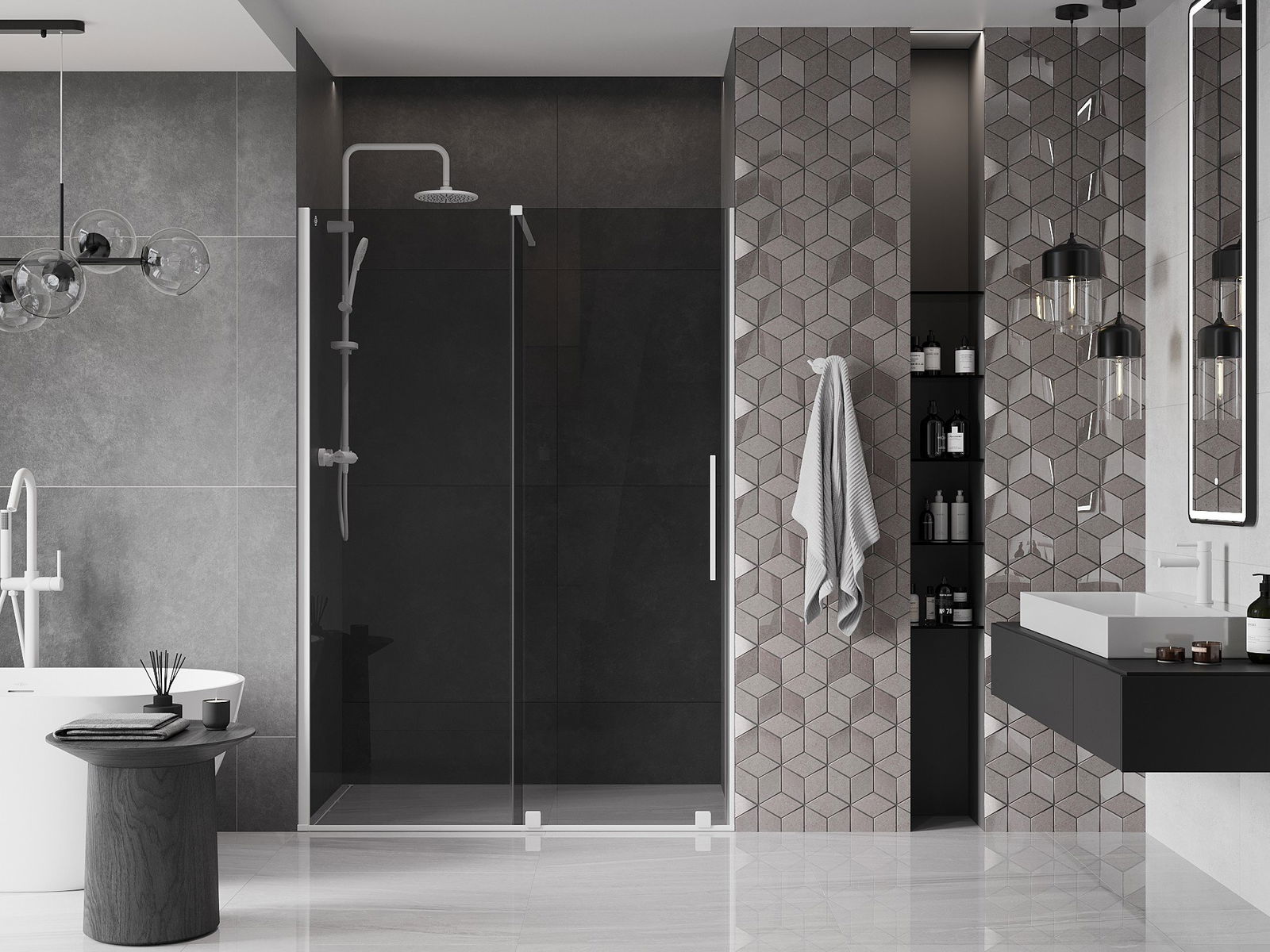 Poręczny i wygodny uchwyt został wykonany ze stali nierdzewnej. Modny kształt w połączeniu z wykończeniem dopasowanym do koloru profili nadaje całości nowoczesnego i stylowego wyglądu, podkreślając estetykę każdej łazienki.