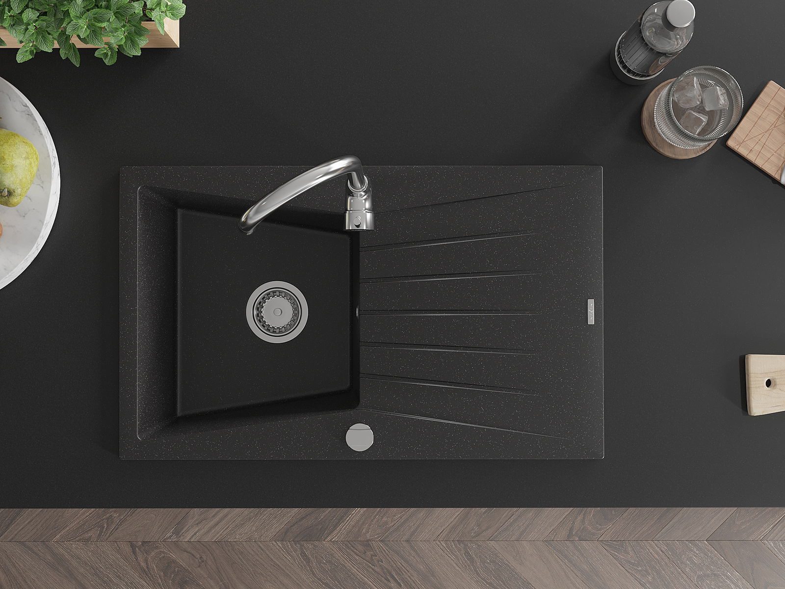 Mexen Cesar zlewozmywak granitowy 1-komorowy z ociekaczem 775 x 470 mm, czarny/srebrny metalik, syfon chrom - 6514771010-73