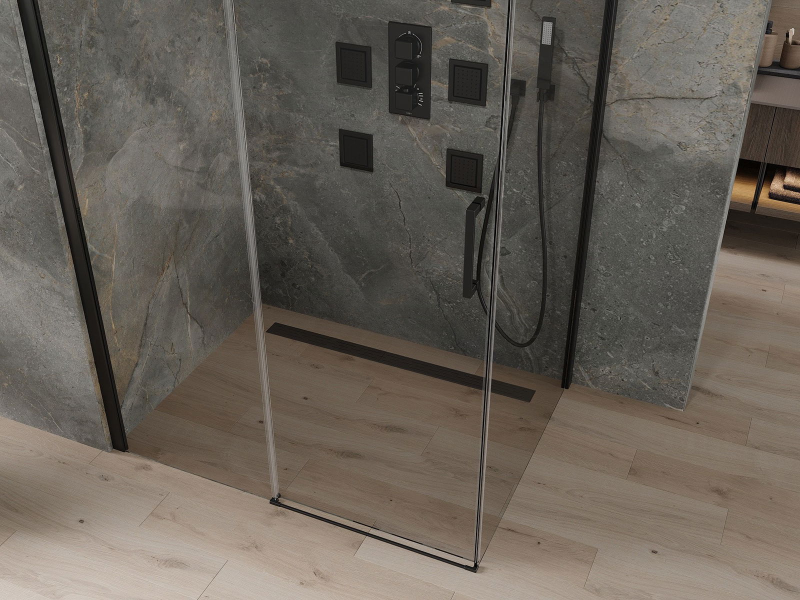Drzwi przesuwne poruszają się po specjalnych prowadnicach i nie wymagają dodatkowej przestrzeni, żeby je otworzyć, dlatego sprawdzą się w mniejszych łazienkach. Dzięki podwójnym rolkom z metalowym korpusem ich ruch jest płynny.