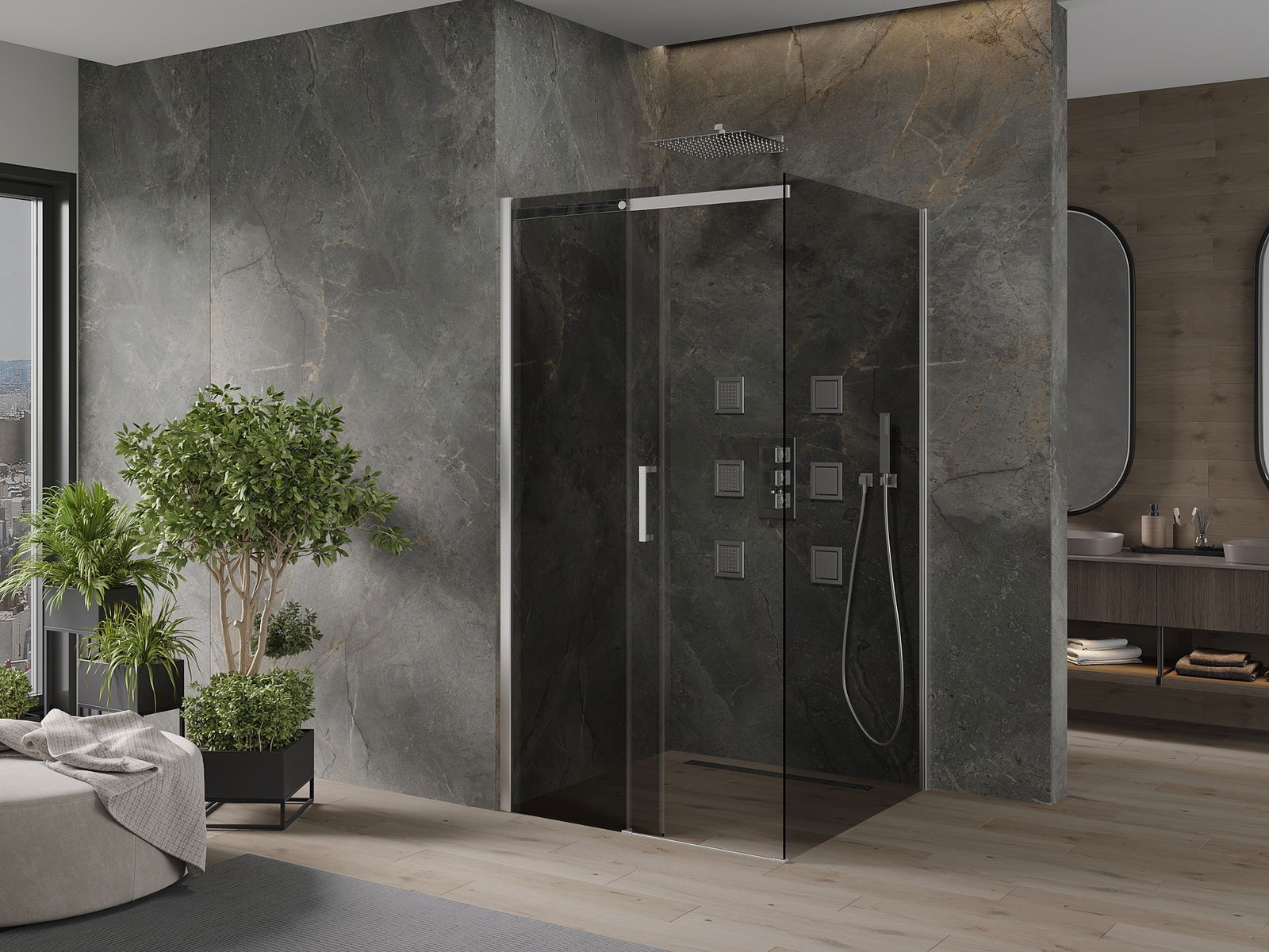 Dzięki zastosowaniu uniwersalnego systemu mocowania, drzwi prysznicowe mogą zostać zamontowane z prawej lub z lewej strony, zależnie od potrzeb. Dzięki temu możesz z łatwością zaprojektować prysznic dopasowany do przestrzeni łazienki.