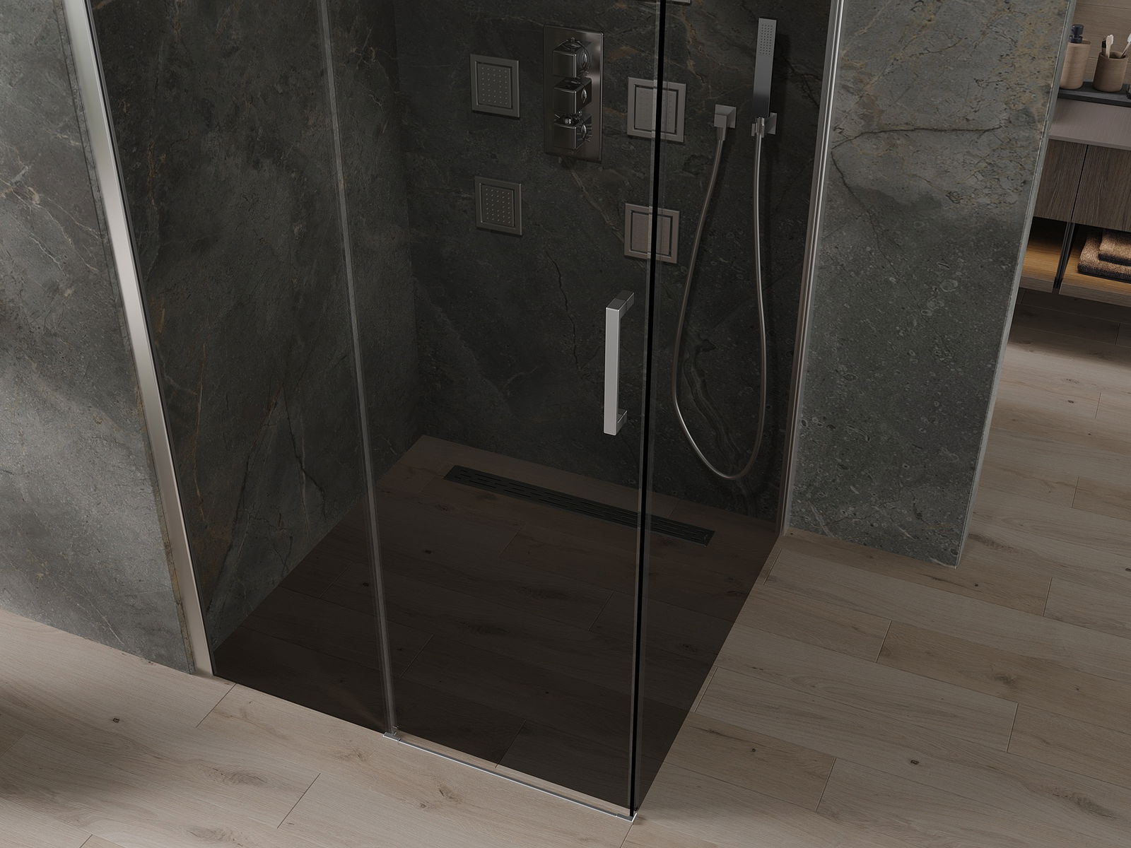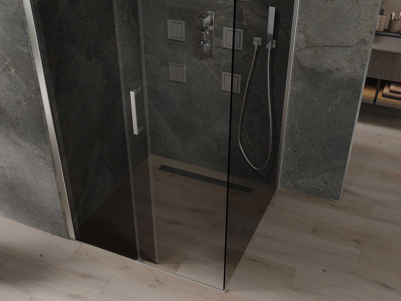Drzwi przesuwne poruszają się po specjalnych prowadnicach i nie wymagają dodatkowej przestrzeni, żeby je otworzyć, dlatego sprawdzą się w mniejszych łazienkach. Dzięki podwójnym rolkom z metalowym korpusem ich ruch jest płynny.