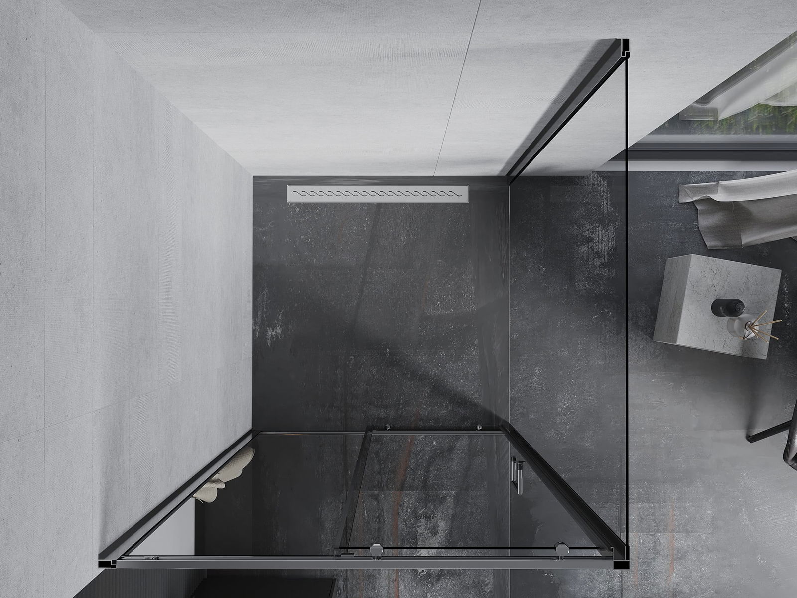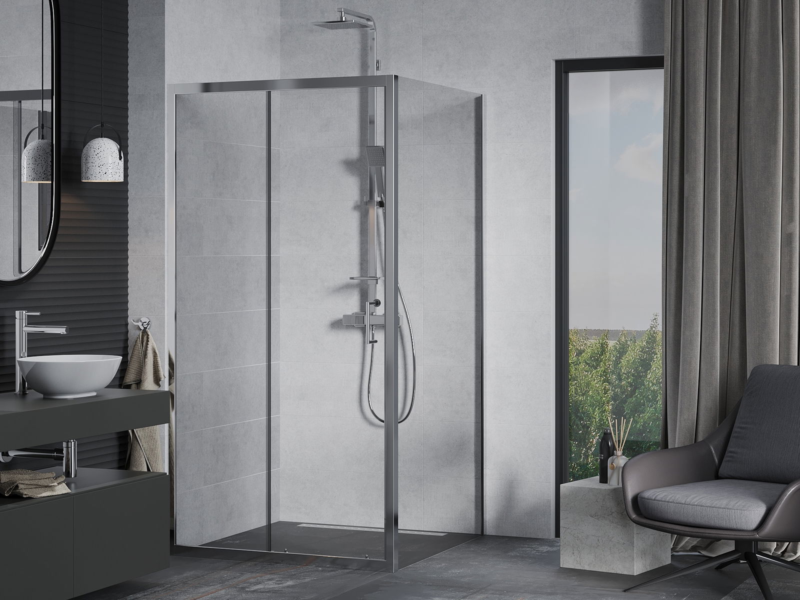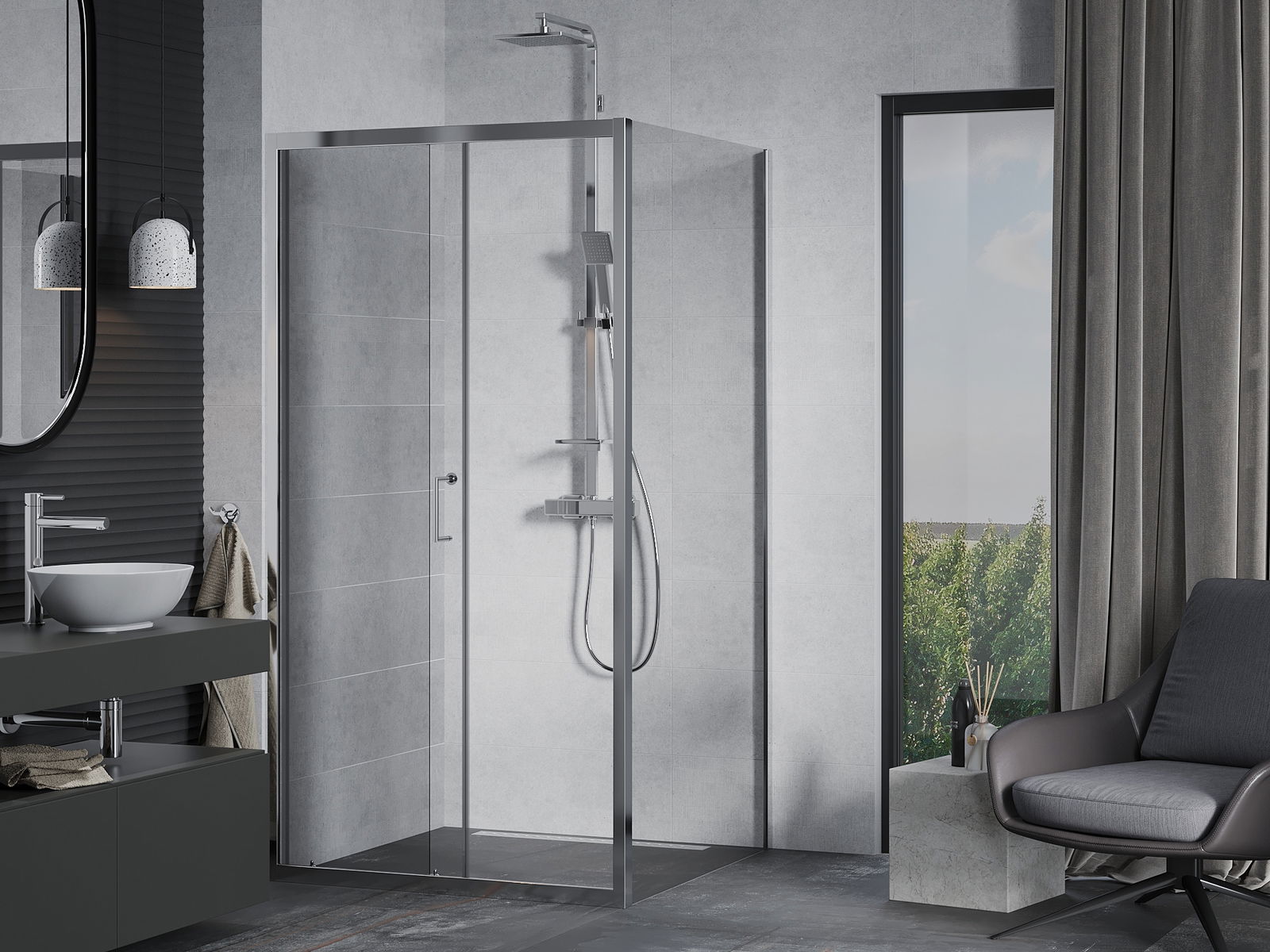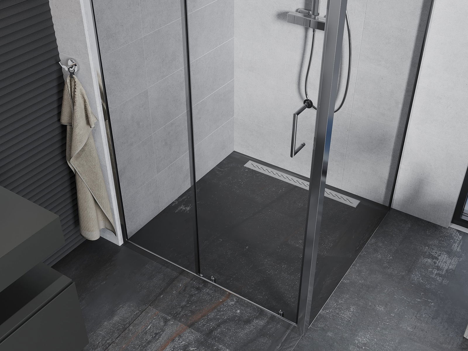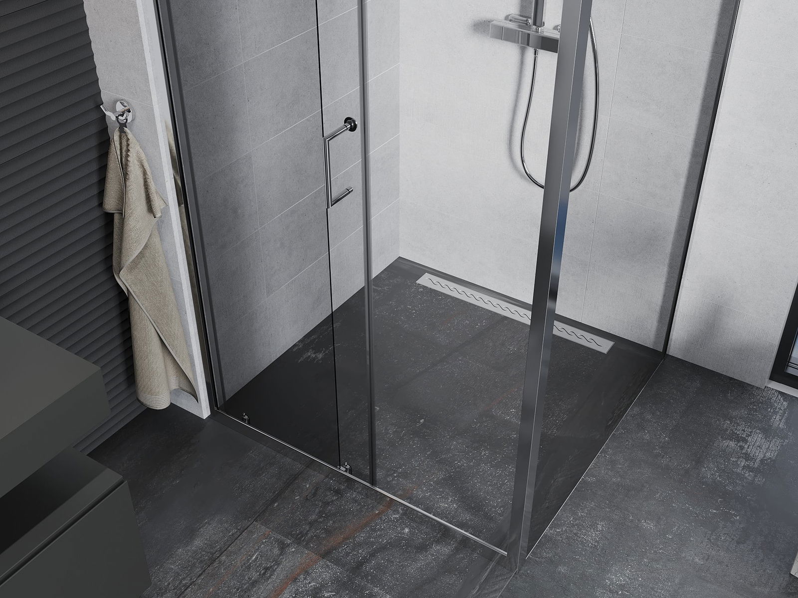 Poręczny i wygodny uchwyt został wykonany z trwałego i odpornego metalu. Modny kształt w połączeniu z wykończeniem dopasowanym do koloru profili nadaje całości nowoczesnego i stylowego wyglądu, podkreślając estetykę każdej łazienki.