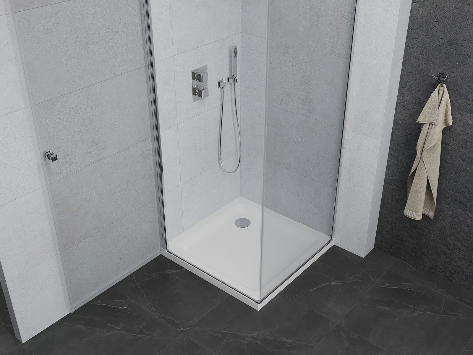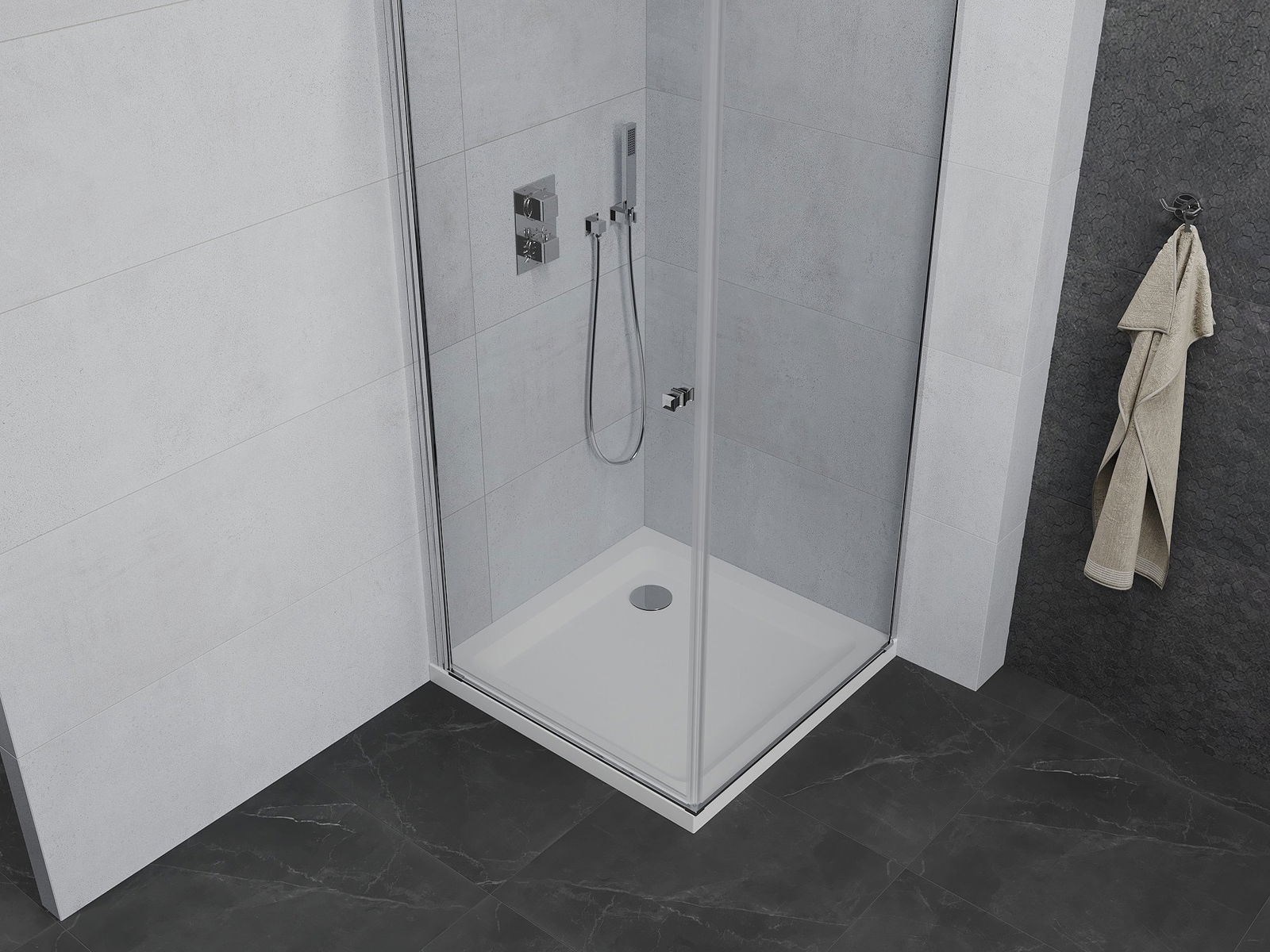 Poręczny i wygodny uchwyt został wykonany z trwałego i odpornego metalu. Modny kształt w połączeniu z wykończeniem dopasowanym do koloru profili nadaje całości nowoczesnego i stylowego wyglądu, podkreślając estetykę każdej łazienki.