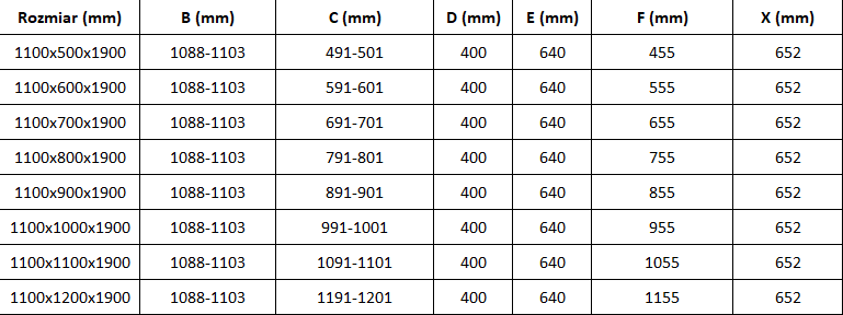 Rozmiar: 110x80 cm (drzwi 110 cm, ścianka 80 cm)