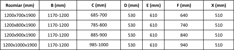 Rozmiar: 120x70 cm (drzwi 120 cm. ścianka 70 cm)