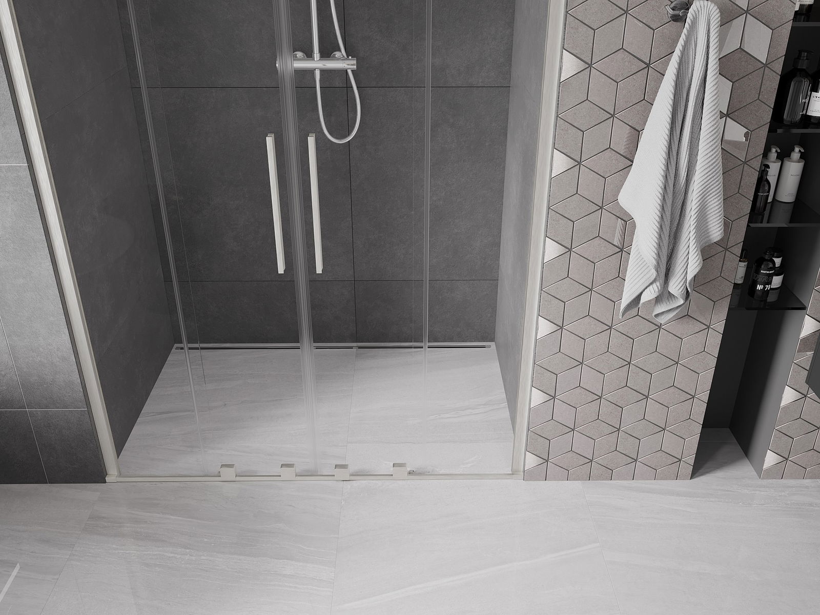 Poręczny i wygodny uchwyt został wykonany ze stali nierdzewnej. Modny kształt w połączeniu z wykończeniem dopasowanym do koloru profili nadaje całości nowoczesnego i stylowego wyglądu, podkreślając estetykę każdej łazienki.