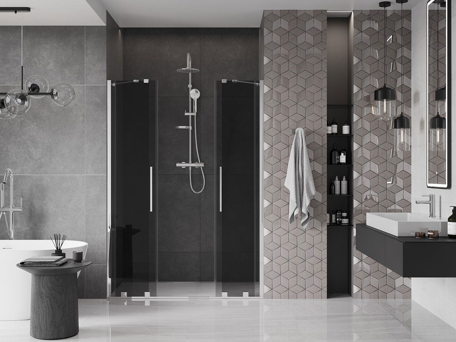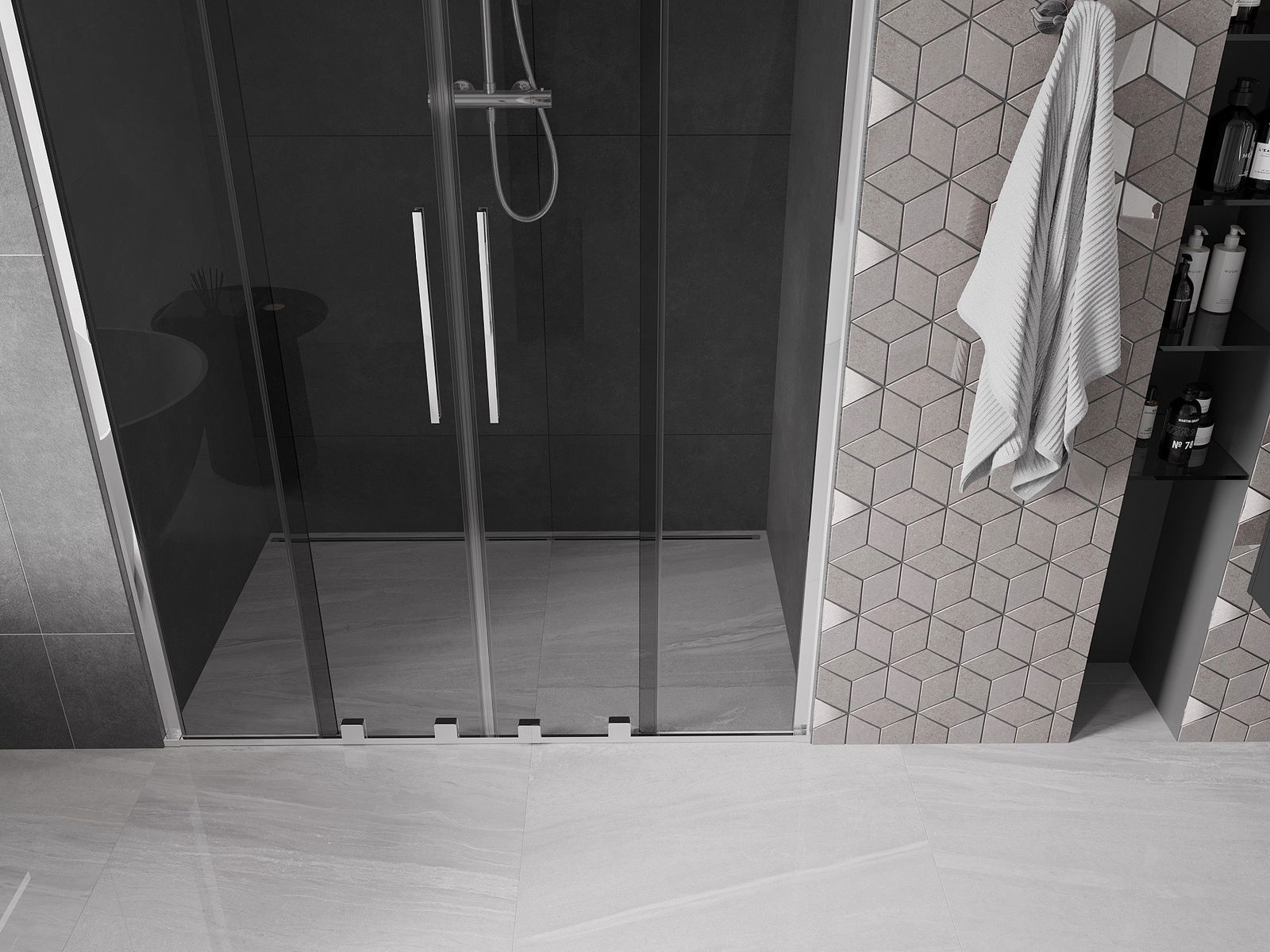 Poręczny i wygodny uchwyt został wykonany ze stali nierdzewnej. Modny kształt w połączeniu z wykończeniem dopasowanym do koloru profili nadaje całości nowoczesnego i stylowego wyglądu, podkreślając estetykę każdej łazienki.