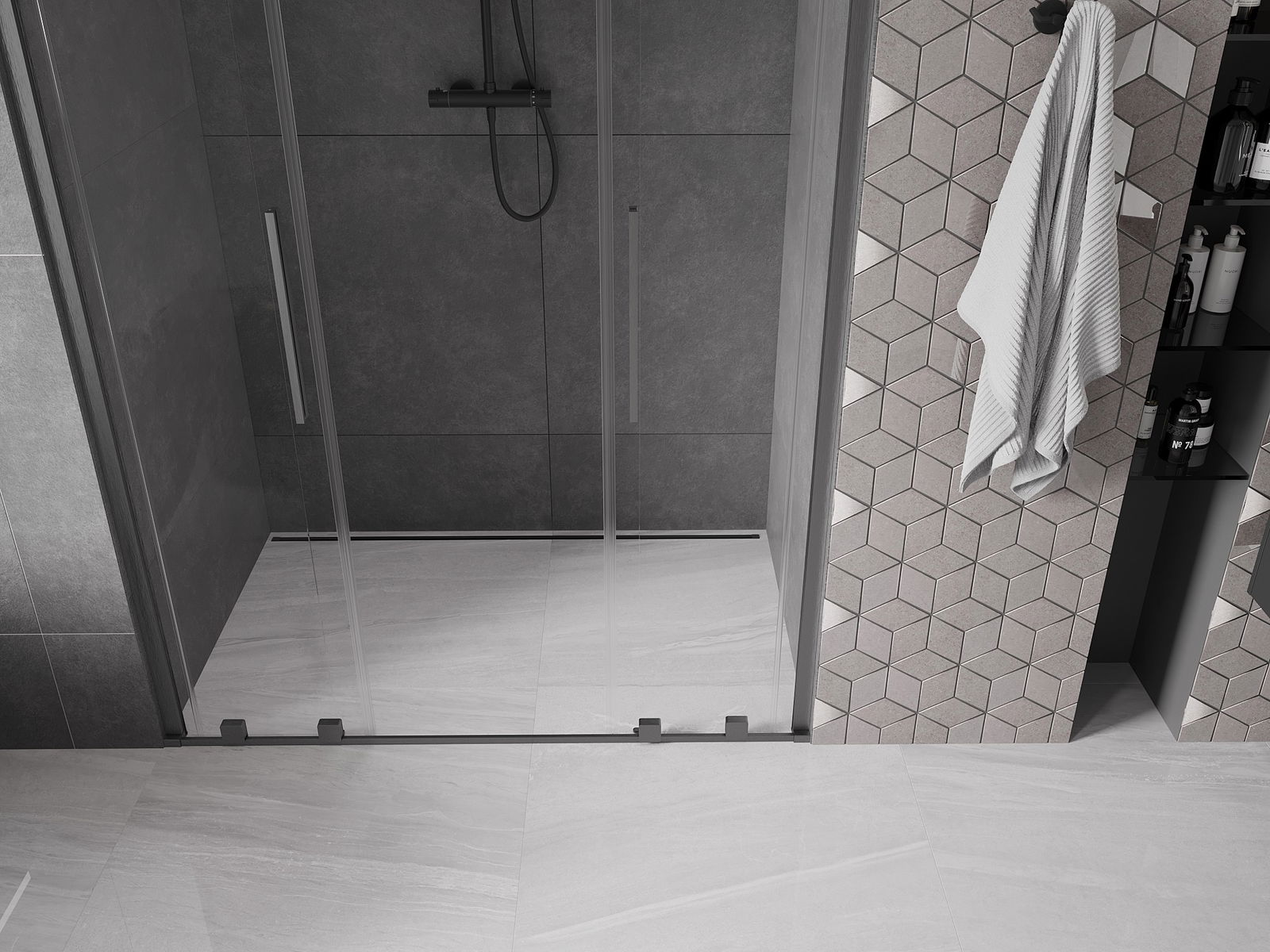 Poręczny i wygodny uchwyt został wykonany ze stali nierdzewnej. Modny kształt w połączeniu z wykończeniem dopasowanym do koloru profili nadaje całości nowoczesnego i stylowego wyglądu, podkreślając estetykę każdej łazienki.