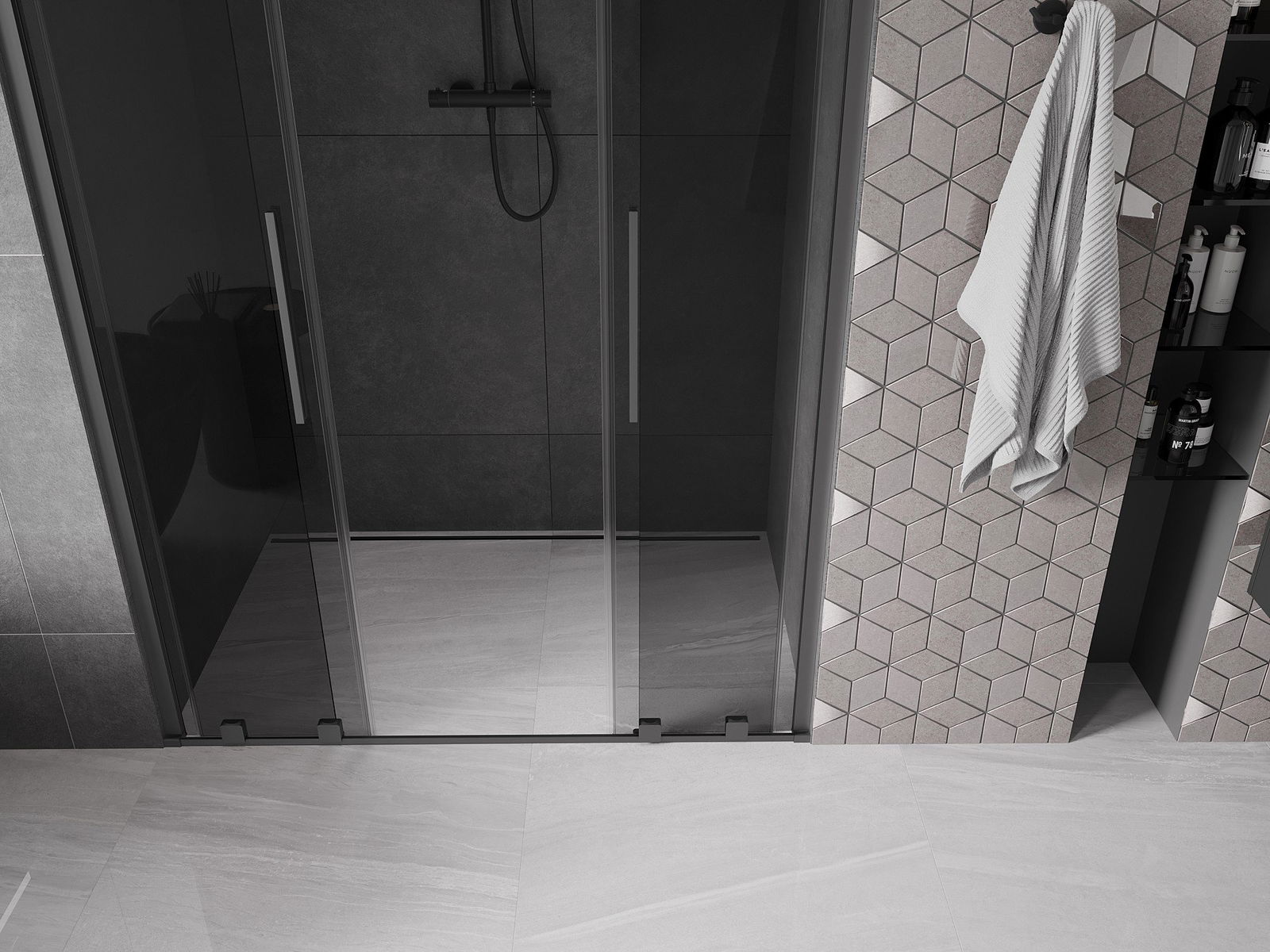 Poręczny i wygodny uchwyt został wykonany ze stali nierdzewnej. Modny kształt w połączeniu z wykończeniem dopasowanym do koloru profili nadaje całości nowoczesnego i stylowego wyglądu, podkreślając estetykę każdej łazienki.