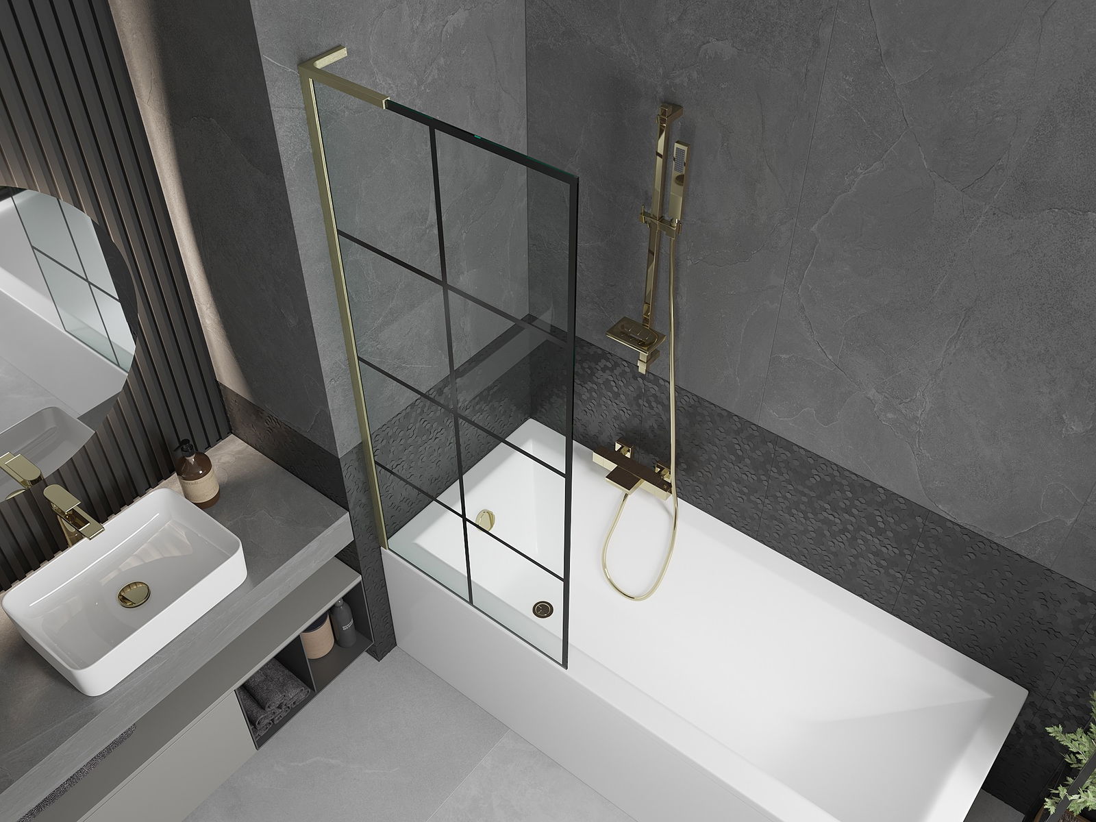 Mexen Next L parawan nawannowy 1-skrzydłowy 70 x 150 cm, czarna kratka, złoty szczotkowany - 895-070-000-03-77-55