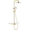 Bateria prysznicowa z półką na kosmetyki to funkcjonalne rozwiązanie, które łączy wygodę użytkowania z estetyką. Półka pozwala na przechowywanie kosmetyków, mydeł, szamponów i innych akcesoriów pod ręką podczas kąpieli.
