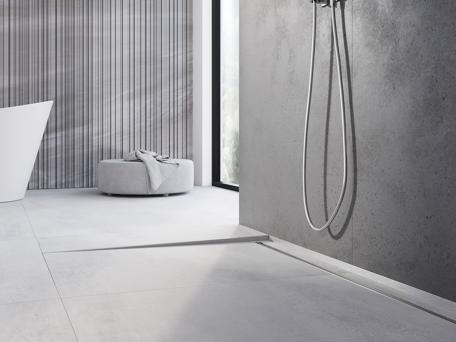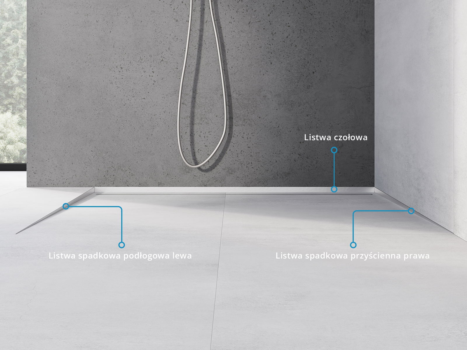 Boczna krawędź listwy wymusza spad jednostronny do odpływu liniowego bez konieczności wykonywania tzw. koperty