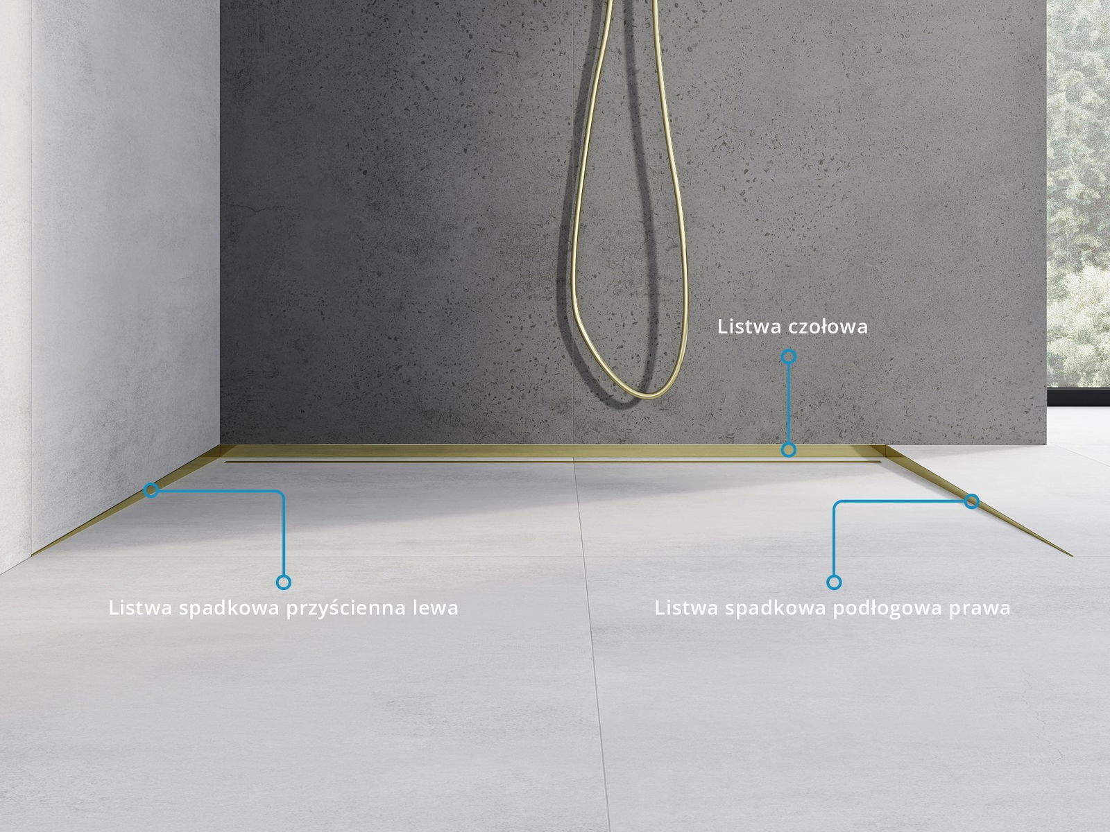 Boczna krawędź listwy wymusza spad jednostronny do odpływu liniowego bez konieczności wykonywania tzw. koperty