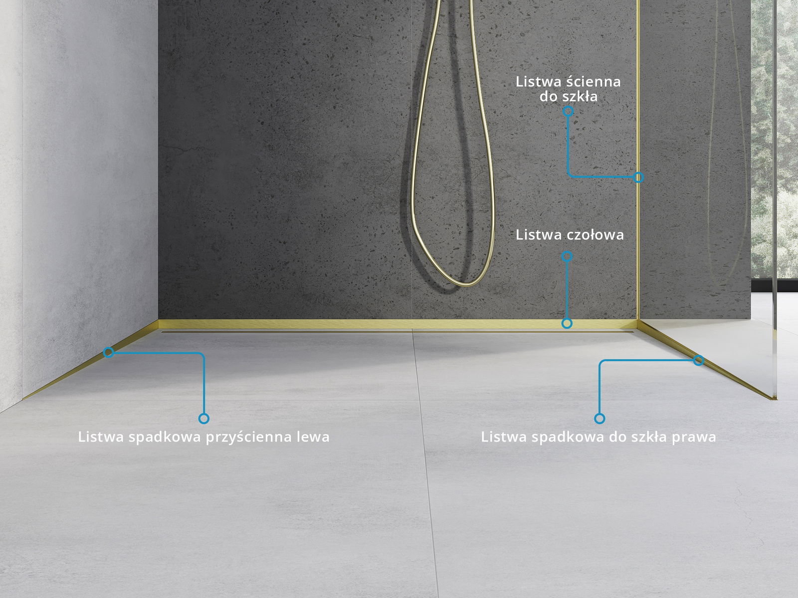 Boczna krawędź listwy wymusza spad jednostronny do odpływu liniowego bez konieczności wykonywania tzw. koperty