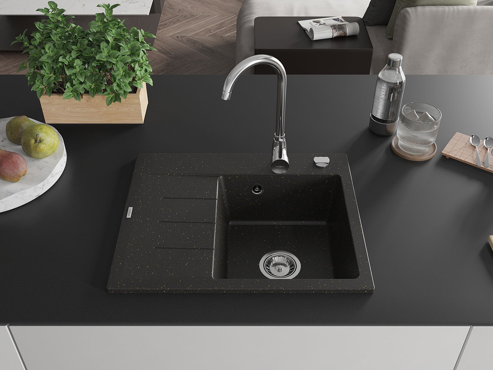 Mexen Ben zlewozmywak granitowy 1-komorowy z ociekaczem prawy 600 x 500 mm, czarny/złoty metalik, syfon chrom - 6523605000-75