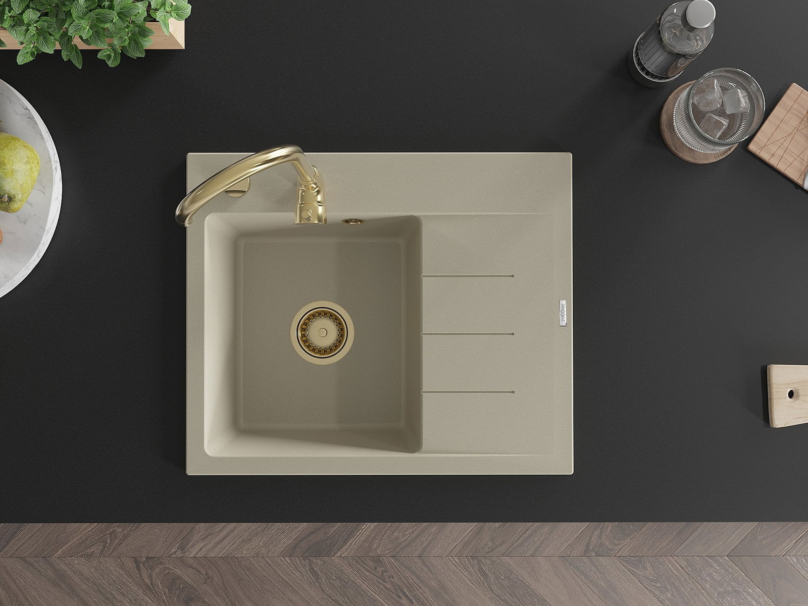 Mexen Ben zlewozmywak granitowy 1-komorowy z ociekaczem lewy 600 x 500 mm, beżowy, syfon złoty - 6522605000-69-G