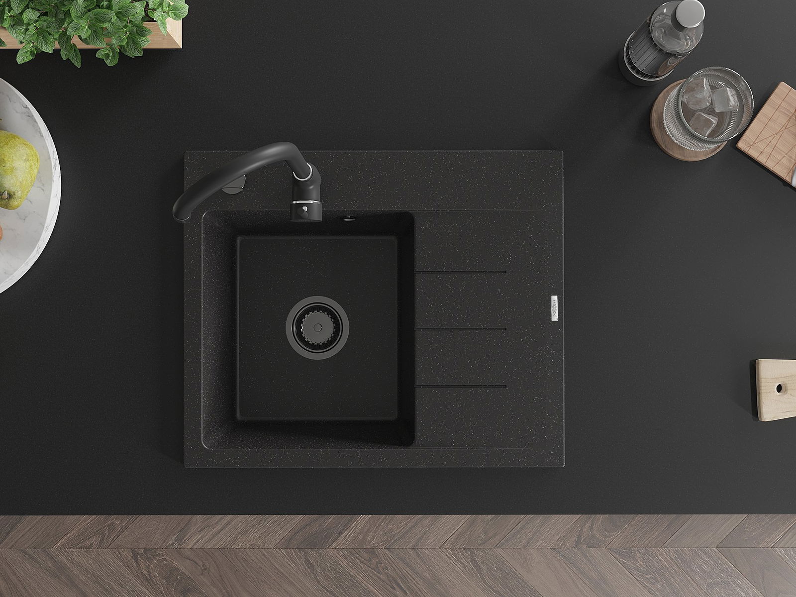 Zlew posiada podfrezowany otwór o średnicy 35 mm do samodzielnego wybicia. Można go wykorzystać m.in. do montażu dozownika na płyn, który wyeliminuje obecność plastikowych butelek w kuchni i nada jej eleganckiego wykończenia.