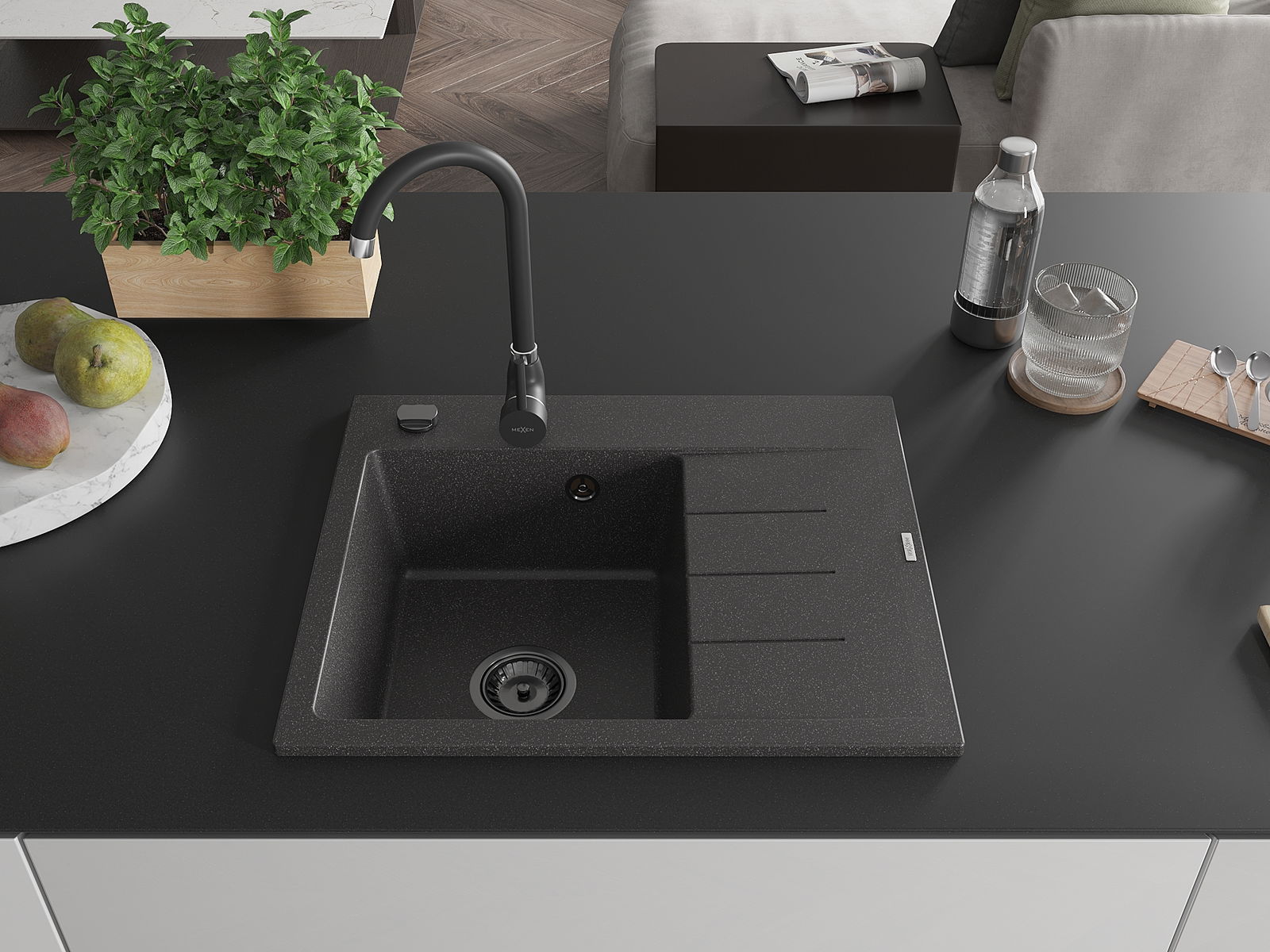 Mexen Ben zlewozmywak granitowy 1-komorowy z ociekaczem lewy 600 x 500 mm, czarny nakrapiany, syfon czarny - 6522605000-76-B