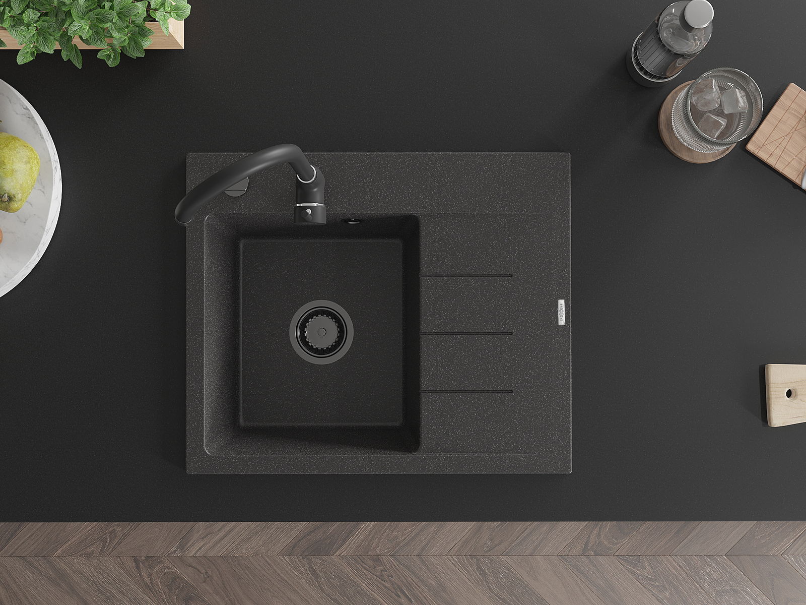 Zlew posiada podfrezowany otwór o średnicy 35 mm do samodzielnego wybicia. Można go wykorzystać m.in. do montażu dozownika na płyn, który wyeliminuje obecność plastikowych butelek w kuchni i nada jej eleganckiego wykończenia.