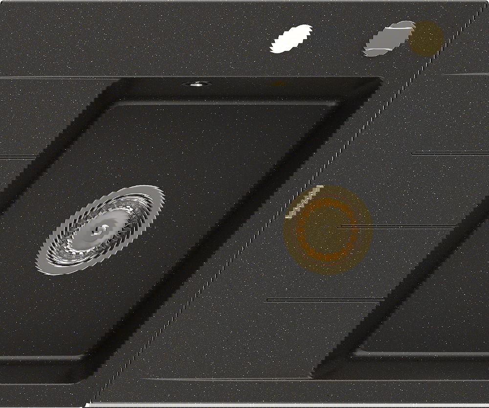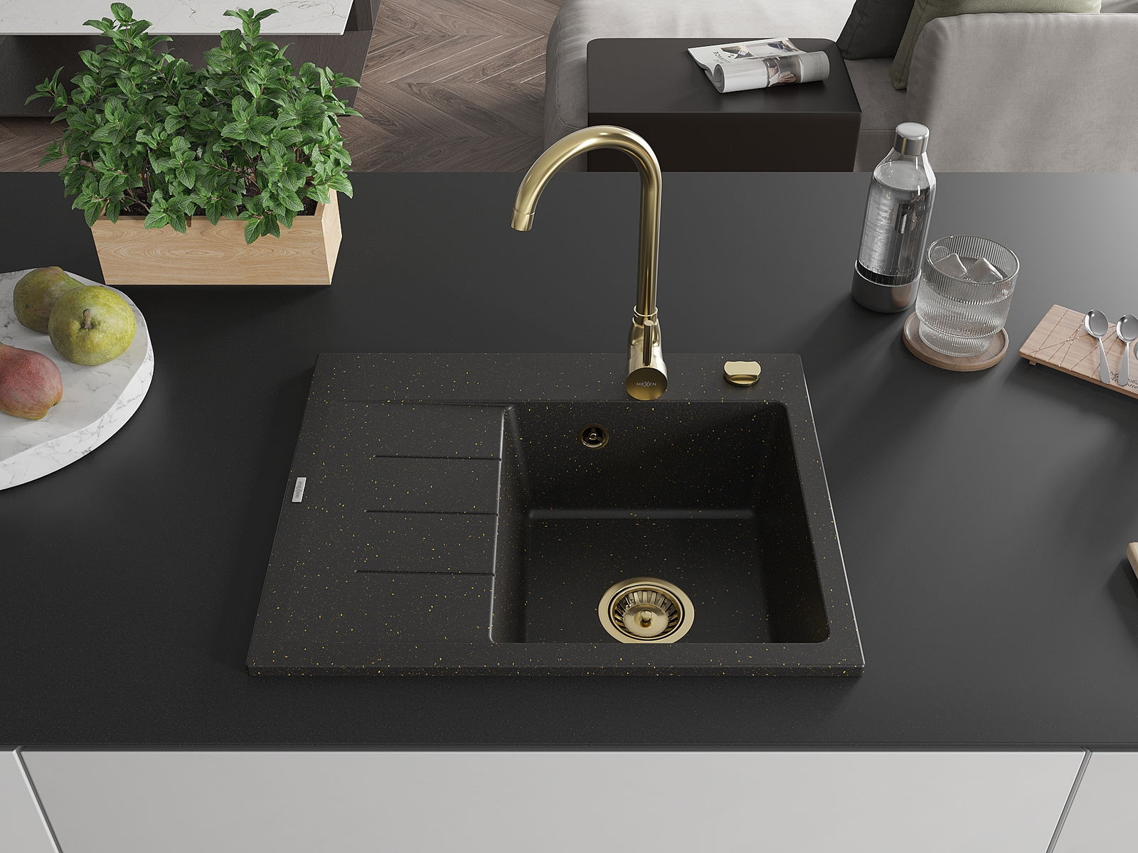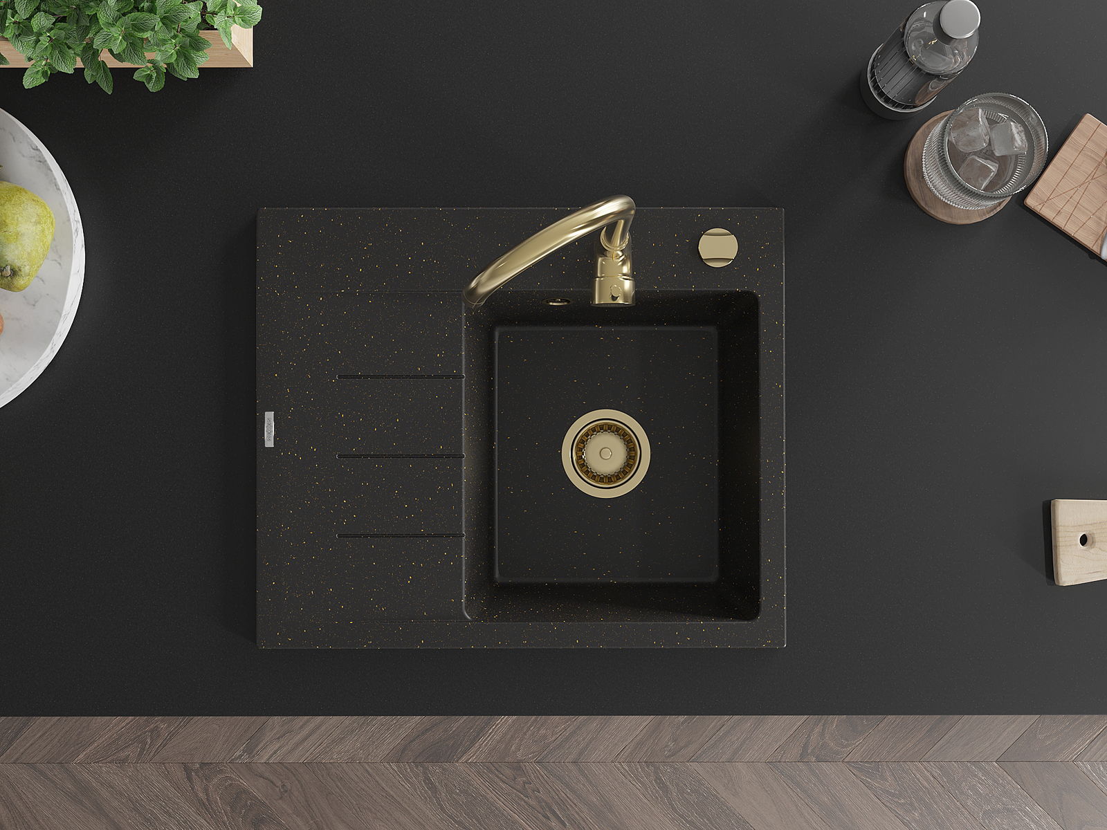 Mexen Ben zlewozmywak granitowy 1-komorowy z ociekaczem prawy 600 x 500 mm, czarny/złoty metalik, syfon złoty - 6523605000-75-G