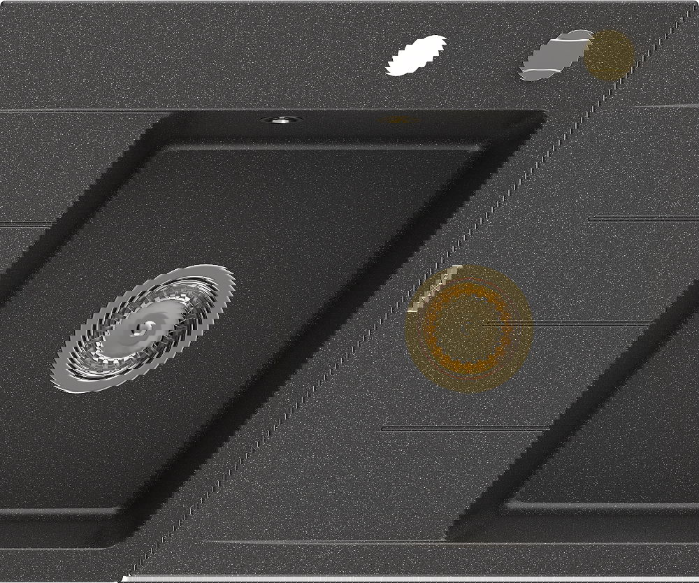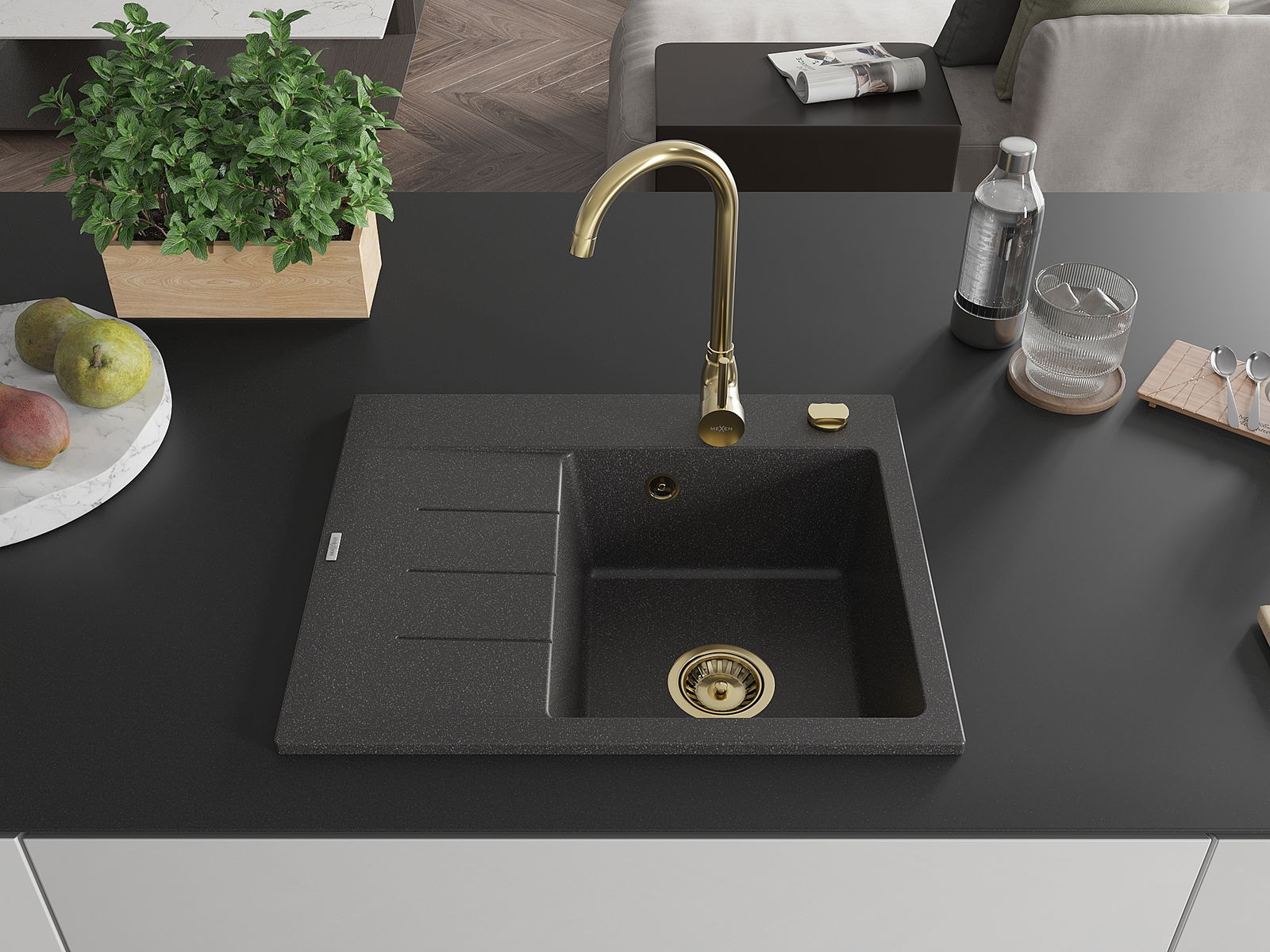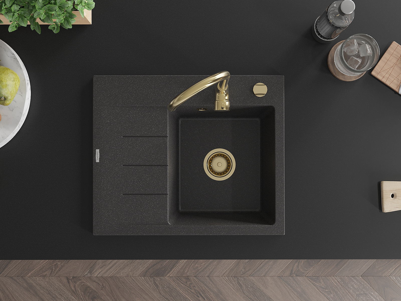 Mexen Ben zlewozmywak granitowy 1-komorowy z ociekaczem prawy 600 x 500 mm, czarny nakrapiany, syfon złoty - 6523605000-76-G
