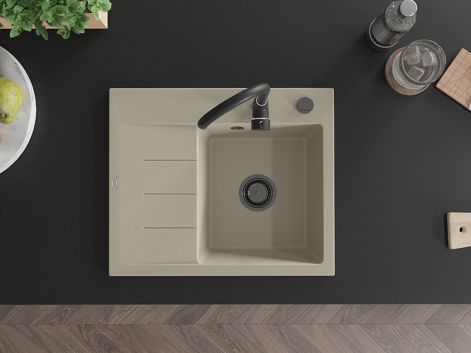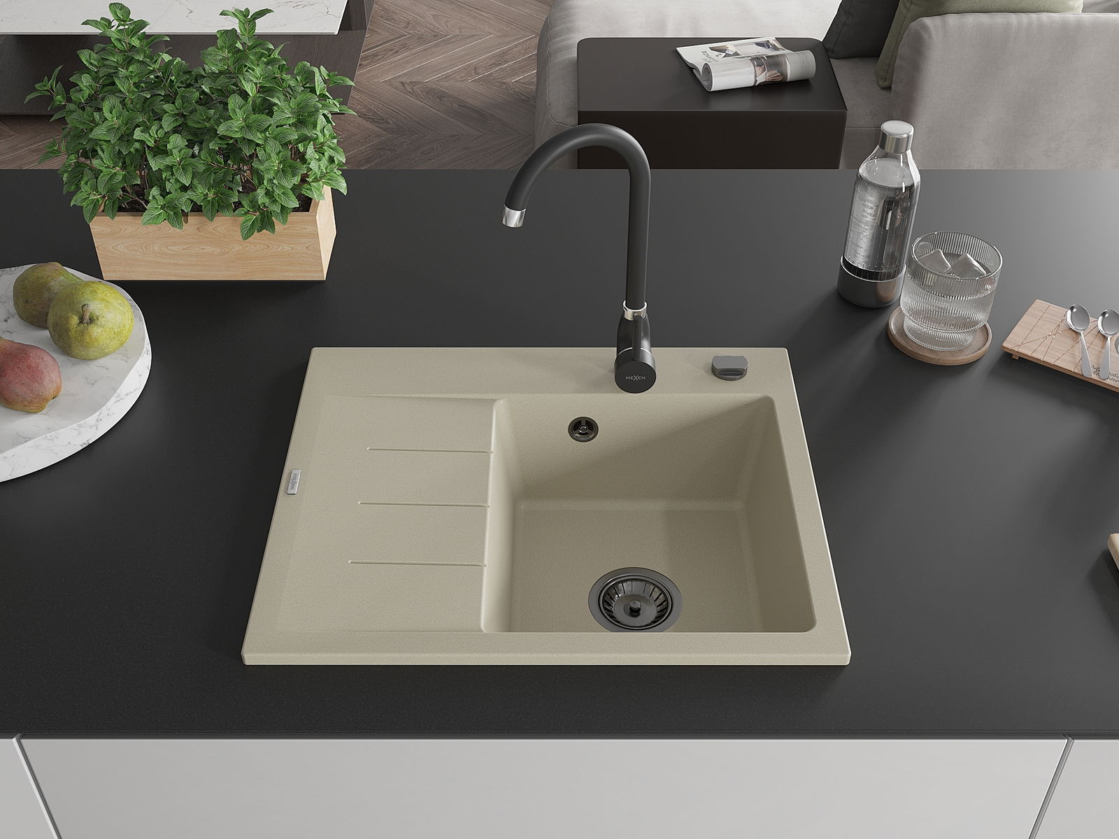 Mexen Ben zlewozmywak granitowy 1-komorowy z ociekaczem prawy 600 x 500 mm, beżowy, syfon czarny - 6523605000-69-B