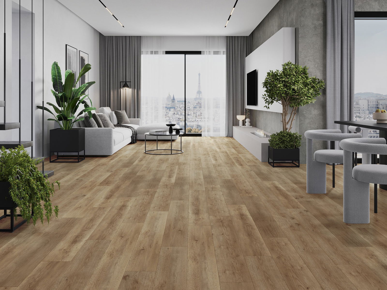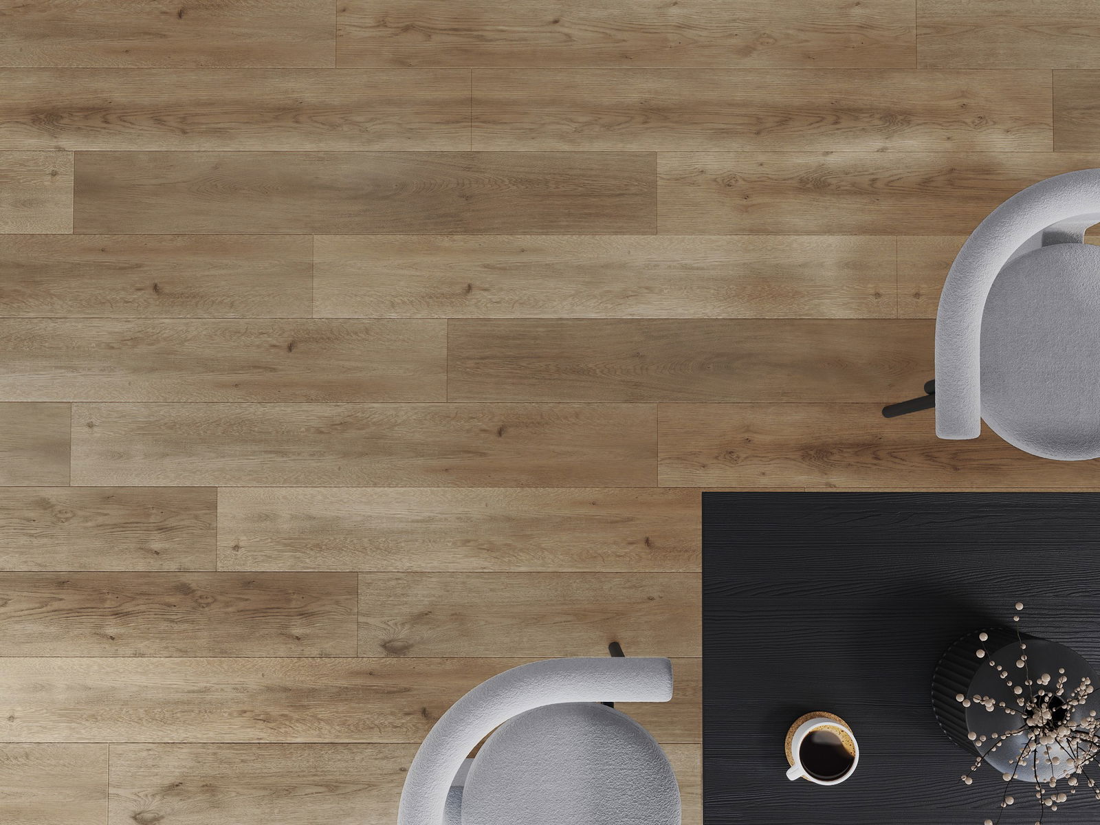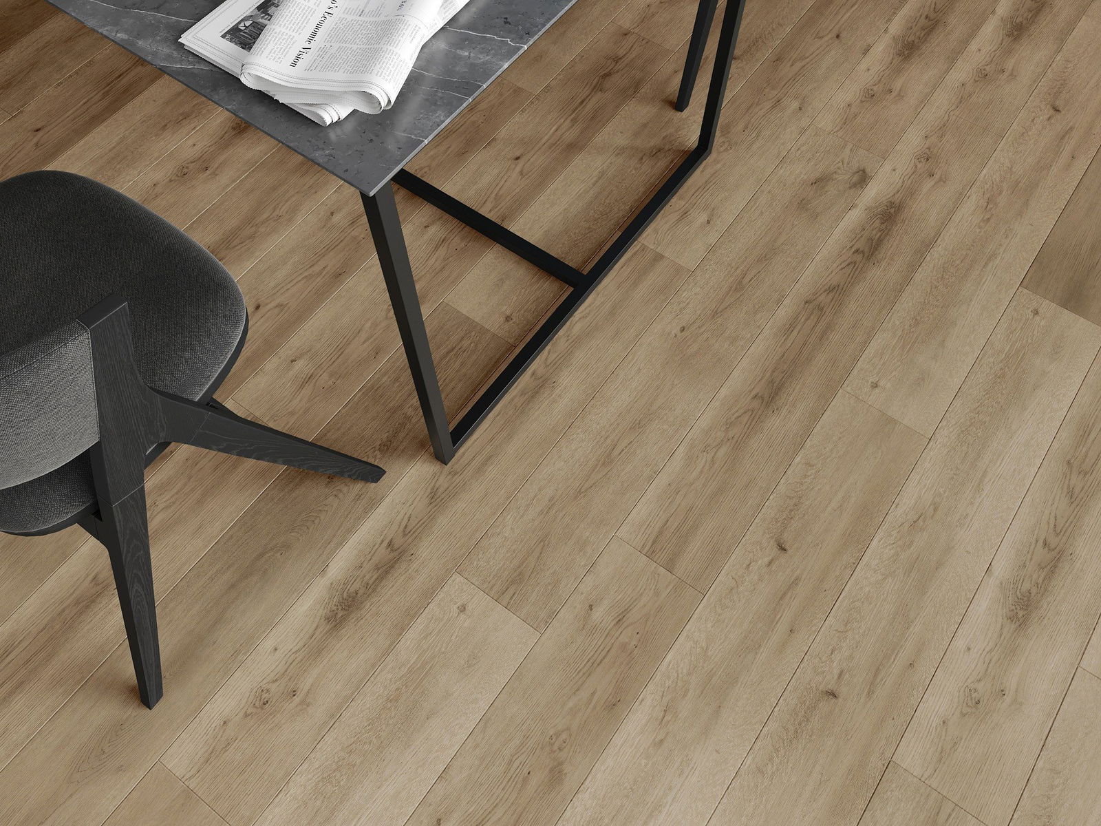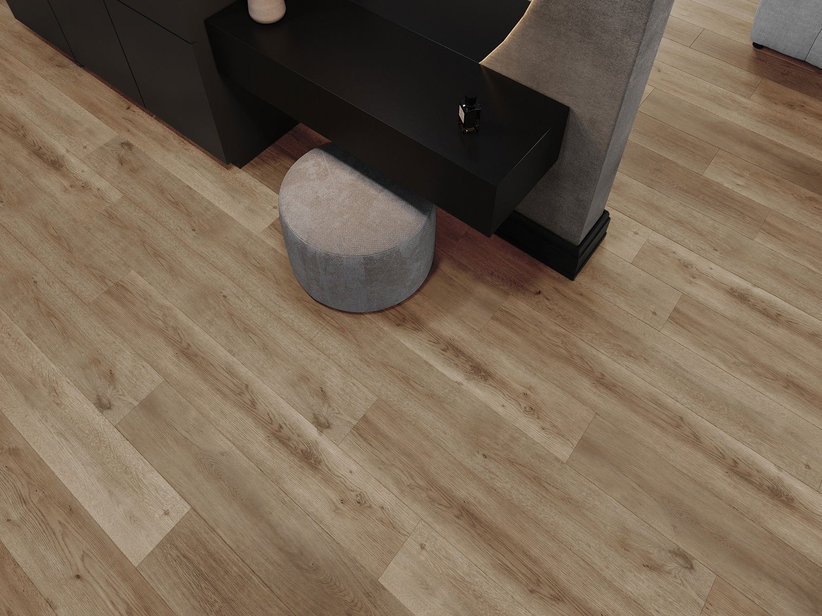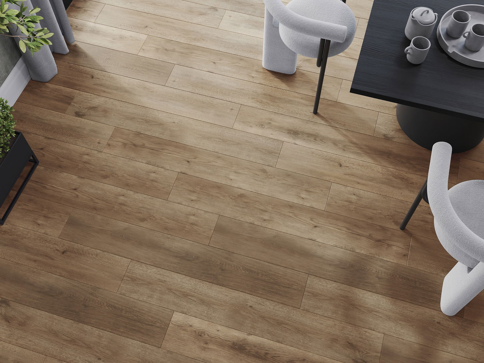 Panele posiadają 4-stronną fugę - każdy bok został wyfrezowany w taki sposób, by po ułożeniu powstało łączenie w kształcie litery V. Taki design sprawia, że podłoga nabiera wyraźniejszej struktury, co nadaje jej głębi i estetycznego charakteru. Efekt ten jest szczególnie ceniony w nowoczesnych aranżacjach, gdzie detale podkreślają wyjątkowy wygląd wnętrza.