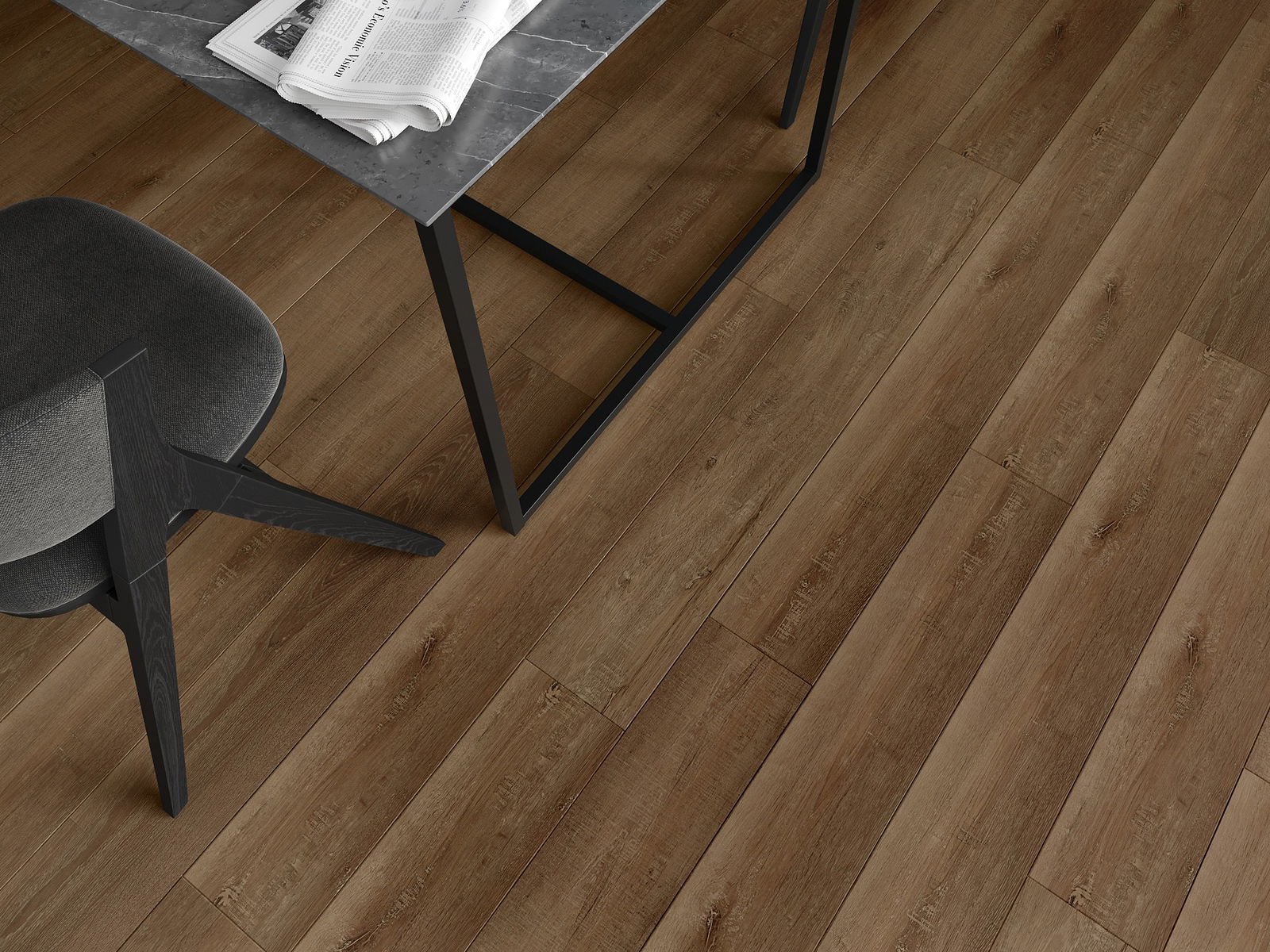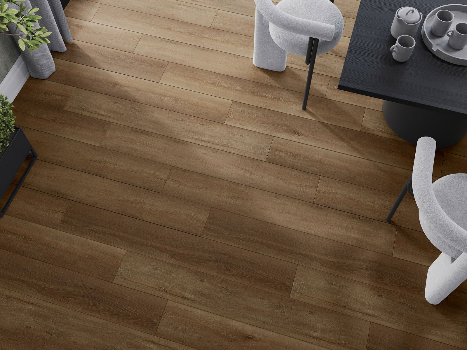 Panele posiadają 4-stronną fugę - każdy bok został wyfrezowany w taki sposób, by po ułożeniu powstało łączenie w kształcie litery V. Taki design sprawia, że podłoga nabiera wyraźniejszej struktury, co nadaje jej głębi i estetycznego charakteru. Efekt ten jest szczególnie ceniony w nowoczesnych aranżacjach, gdzie detale podkreślają wyjątkowy wygląd wnętrza.