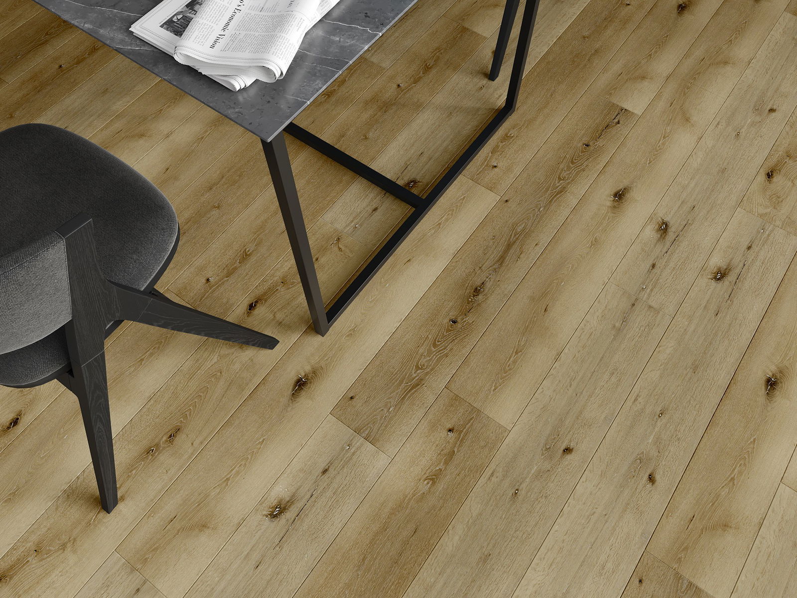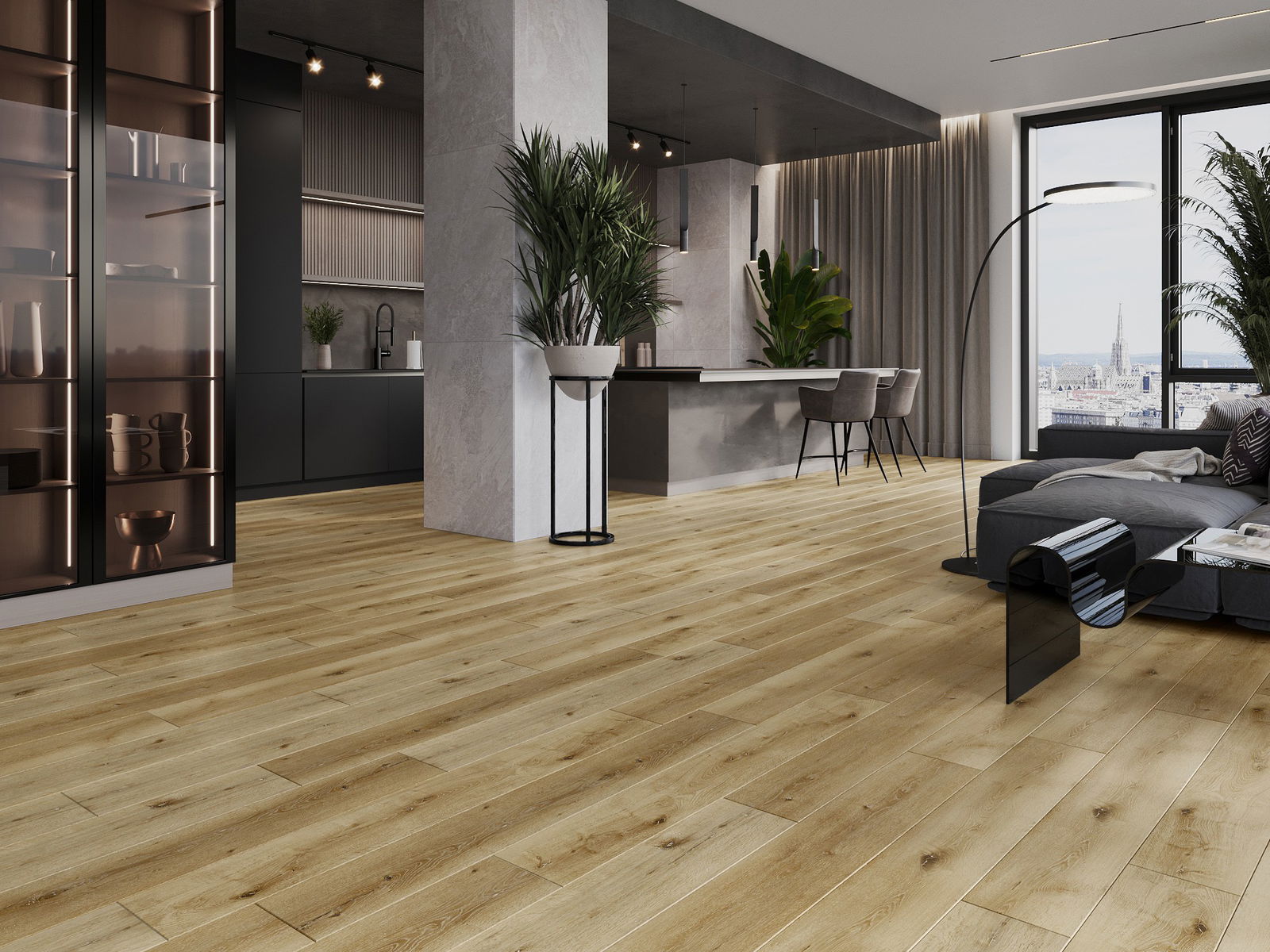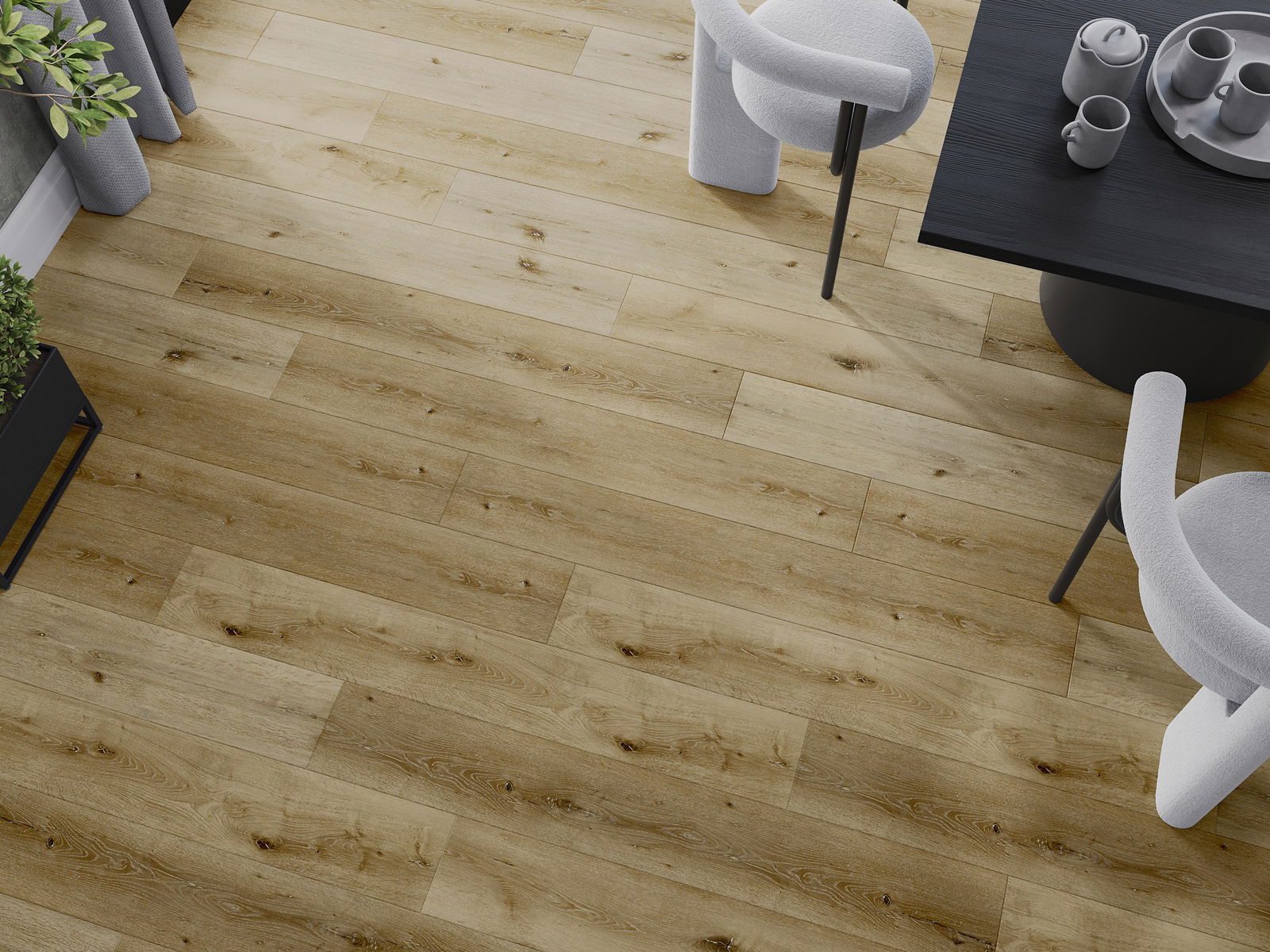 Panele posiadają 4-stronną fugę - każdy bok został wyfrezowany w taki sposób, by po ułożeniu powstało łączenie w kształcie litery V. Taki design sprawia, że podłoga nabiera wyraźniejszej struktury, co nadaje jej głębi i estetycznego charakteru. Efekt ten jest szczególnie ceniony w nowoczesnych aranżacjach, gdzie detale podkreślają wyjątkowy wygląd wnętrza.